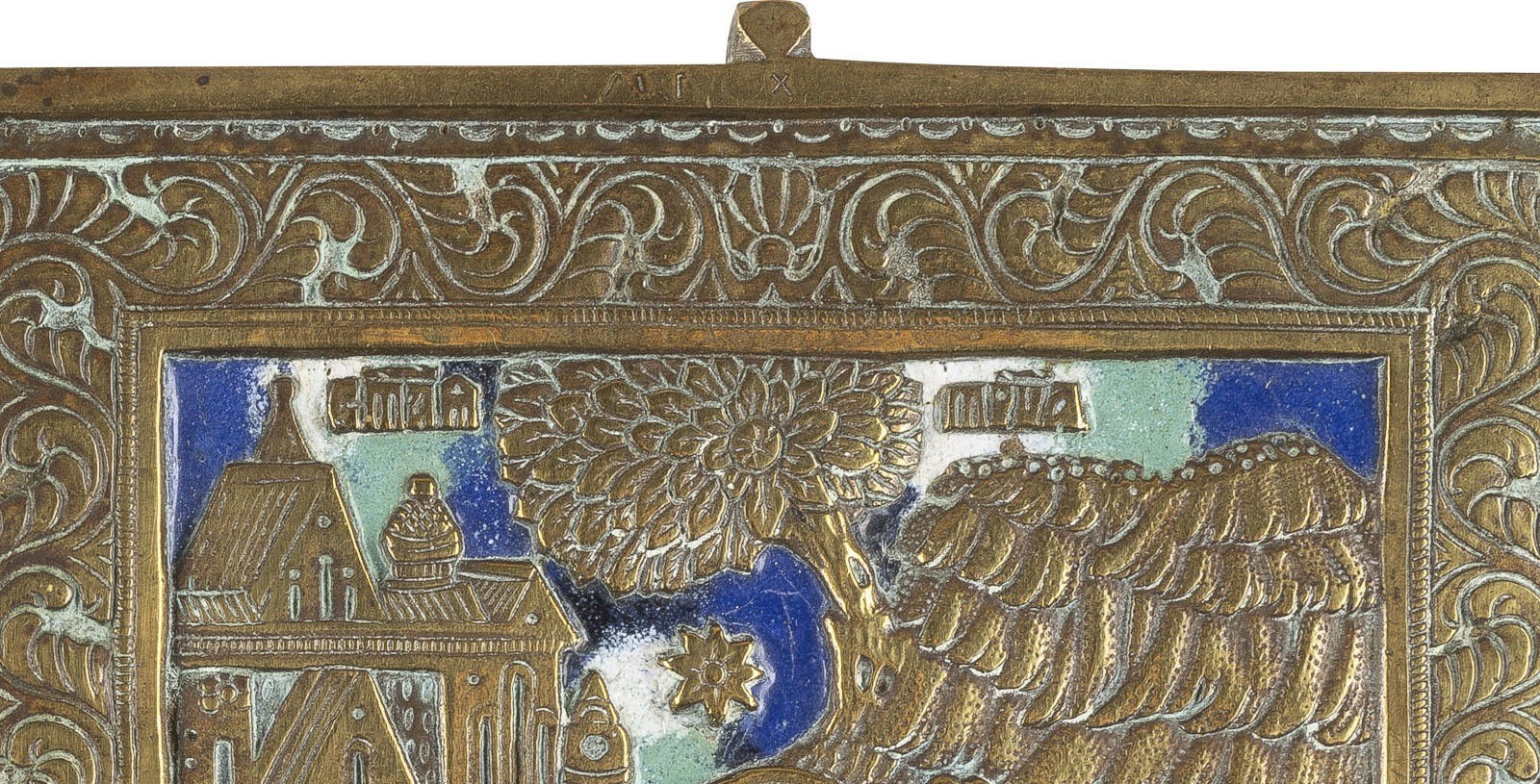 Bronze, reliefiert gegossen, mehrfarbig emailliert. H. 11,7/11,8 cm. Eine Ikone am oberen Rand in Kyrillisch signiert 'M.R.S.Ch.'. Email part. best.