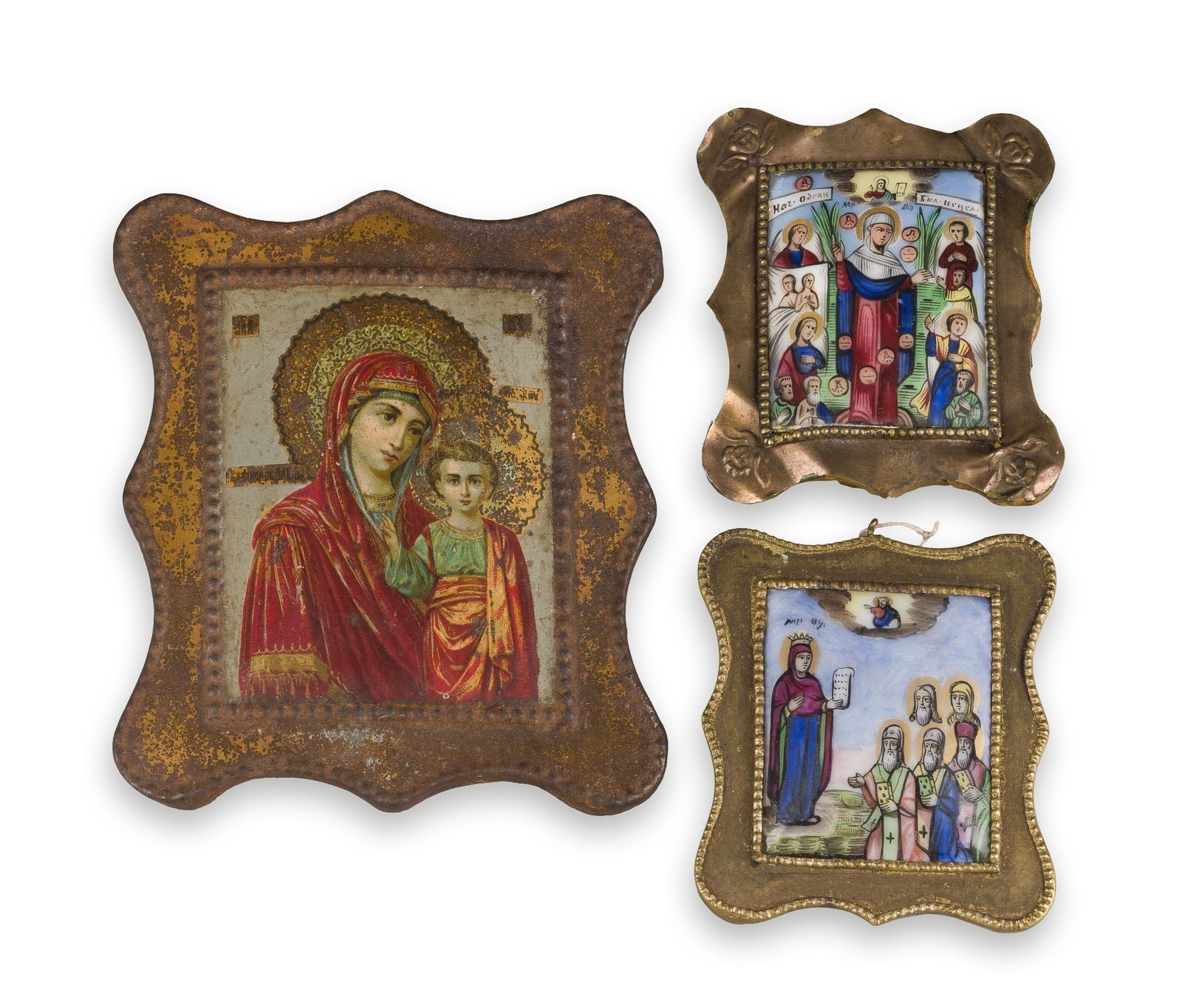 Polychrome Emailmalerei auf Metall, Messingmontierung / Chromolithographie auf Metall. H. 6,5-10,4 cm. Rahmen teils besch.