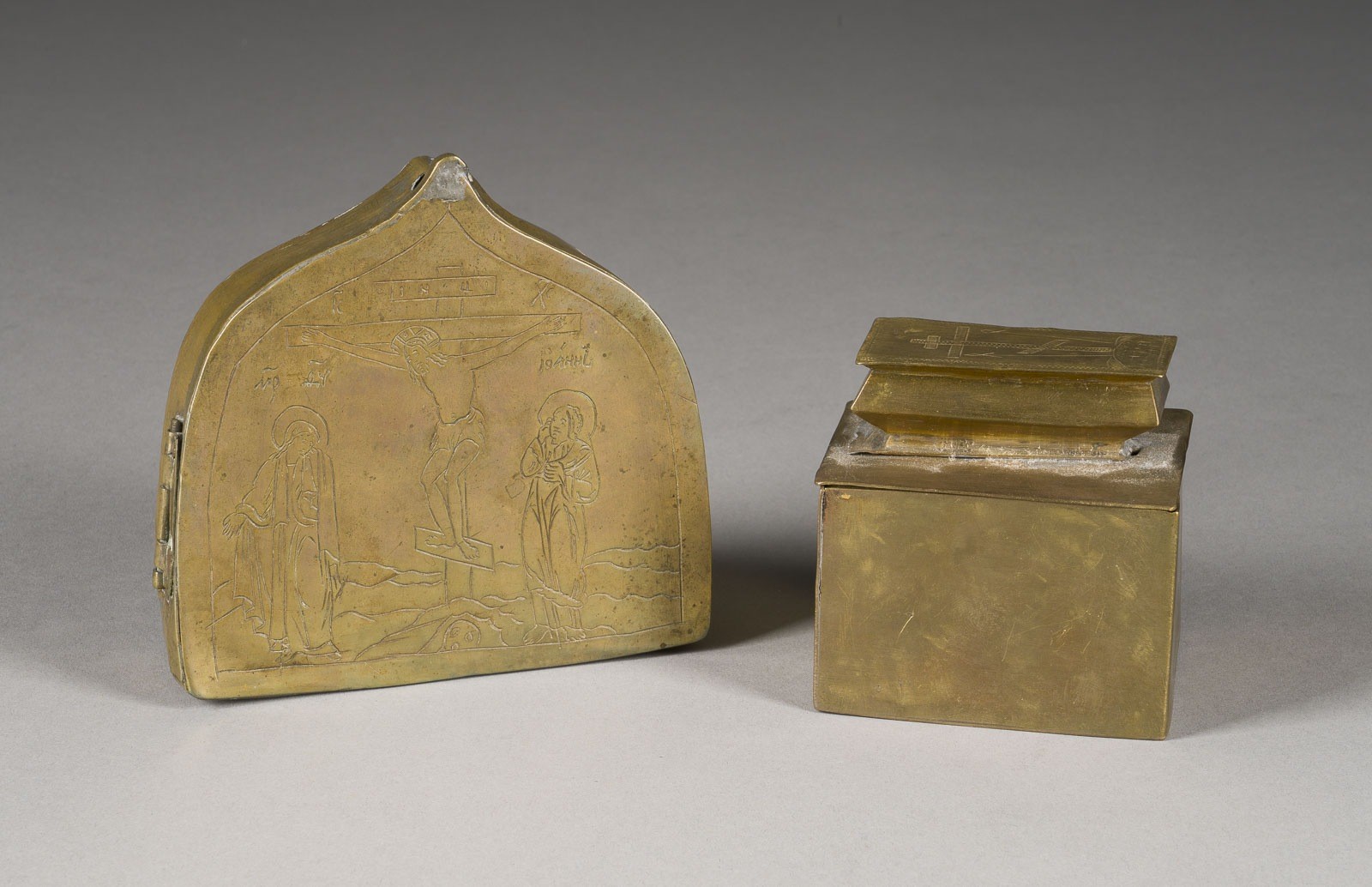 Messing, teils graviert. H. 7 / 10,5 cm. Gebrauchsspuren.