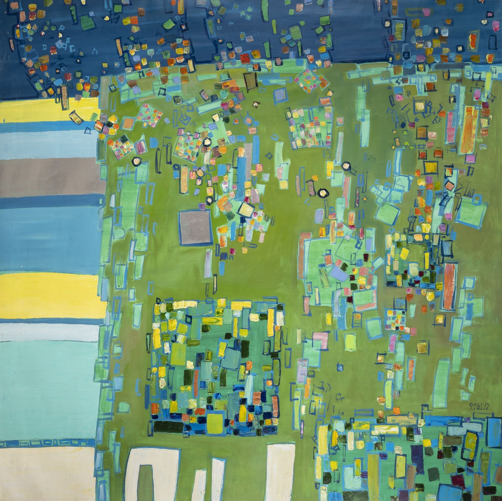Öl auf Leinwand. 180 x 180 cm. Unten rechts in Kyrillisch signiert und datiert 'Oleg Lunjov (20)19'. Verso: Im Randbereich part. min. mit Farbverlusten, part. min. ber.