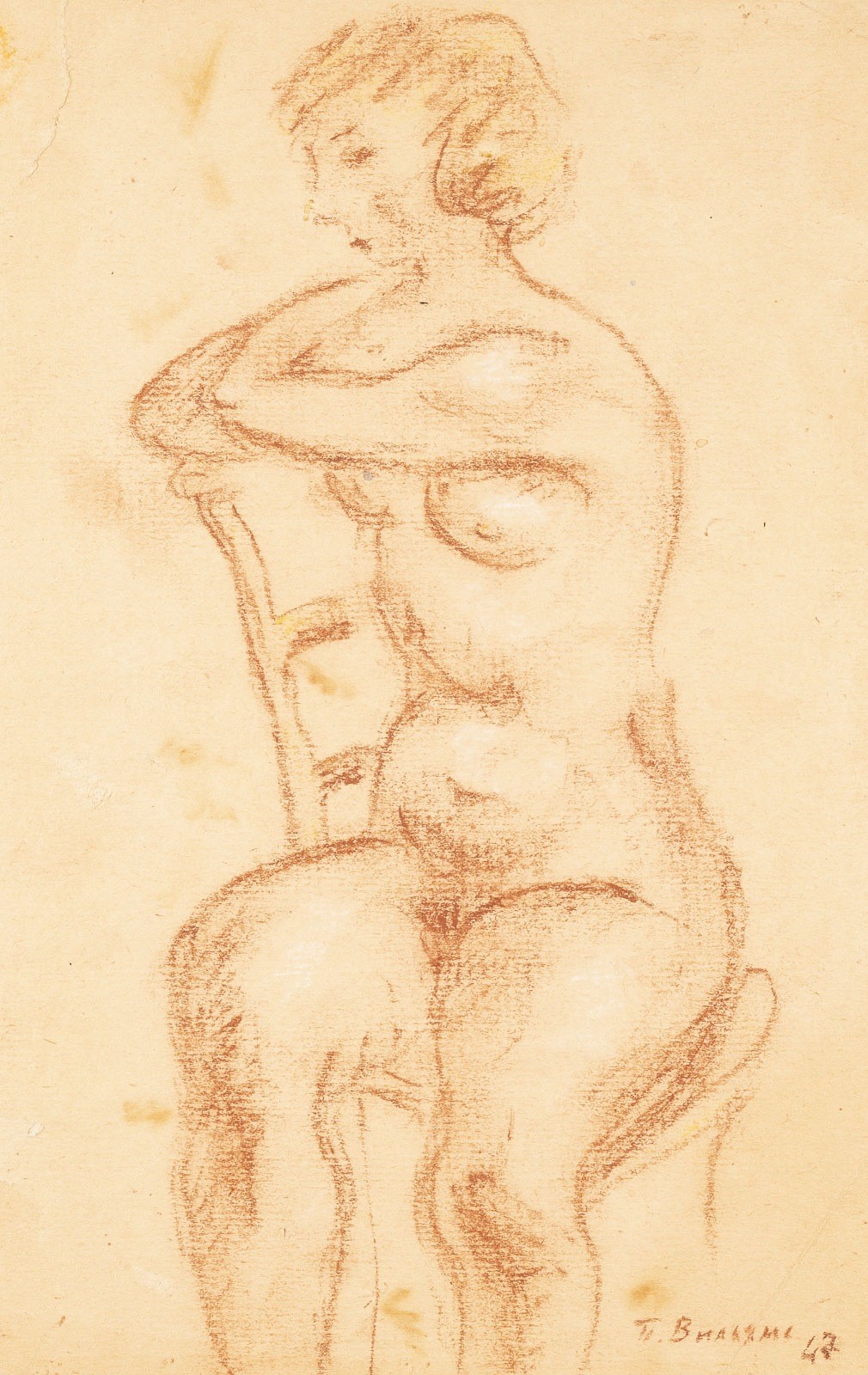 Rötelzeichnung auf Papier maroufliert auf Karton. 33 x 25 cm. Unten rechts in Kyrillisch signiert und datiert 'P. Wiljams 47', oben links nummeriert '62'. Part. verschm., part. zerrissen.