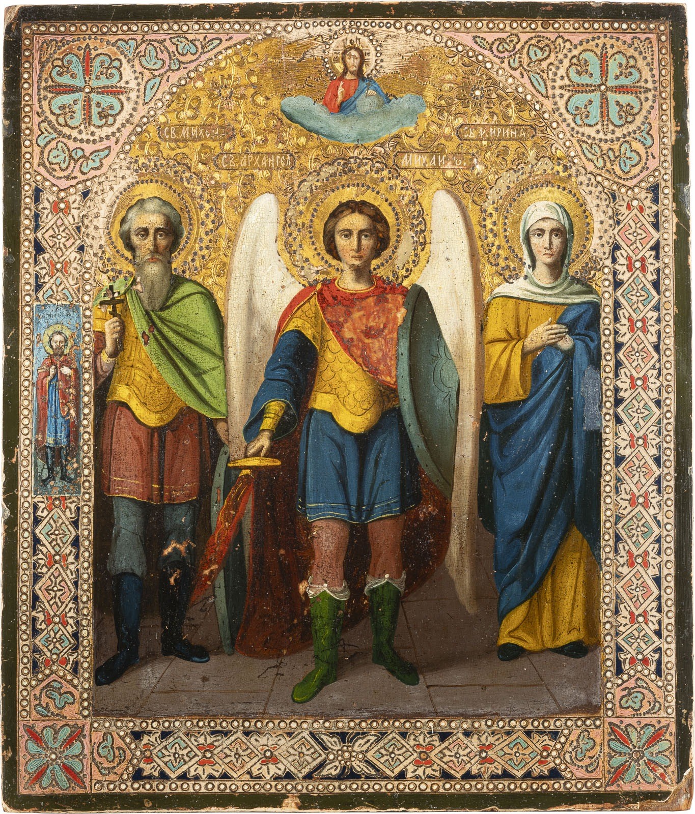 BEZEICHNETE IKONE MIT DEM ERZENGEL MICHAEL FLANKIERT VON DEN HEILIGEN MICHAEL UND IRINA