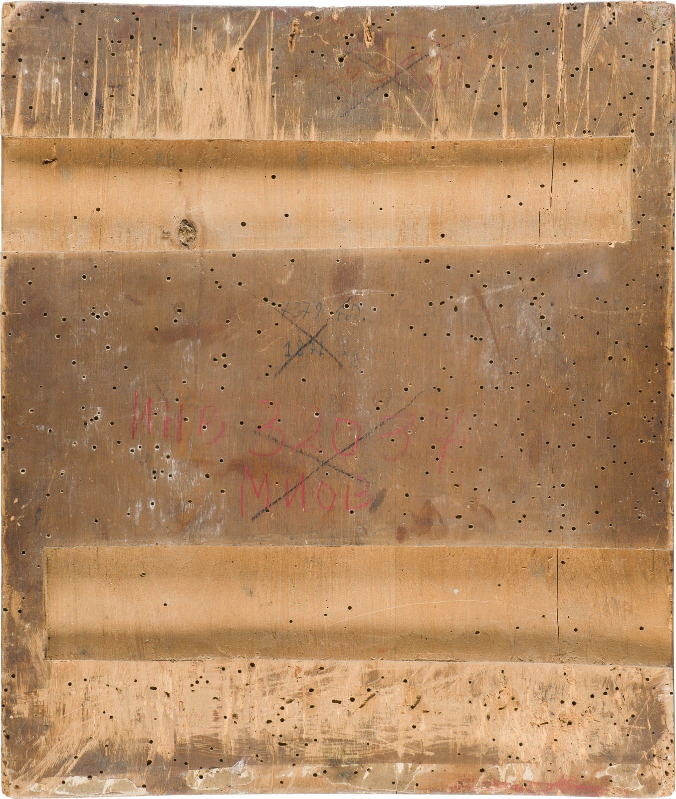 Verbund zweier Bretter mit zwei Rückseiten-Sponki (verloren). Kowtscheg, Eitempera auf Kreidegrund, Goldgrund. 35,3 x 31 cm. Kyrillische Datierung '7374' am unteren Rand. Verso kyrillische Inventarnummer in Rot. Min. rest.