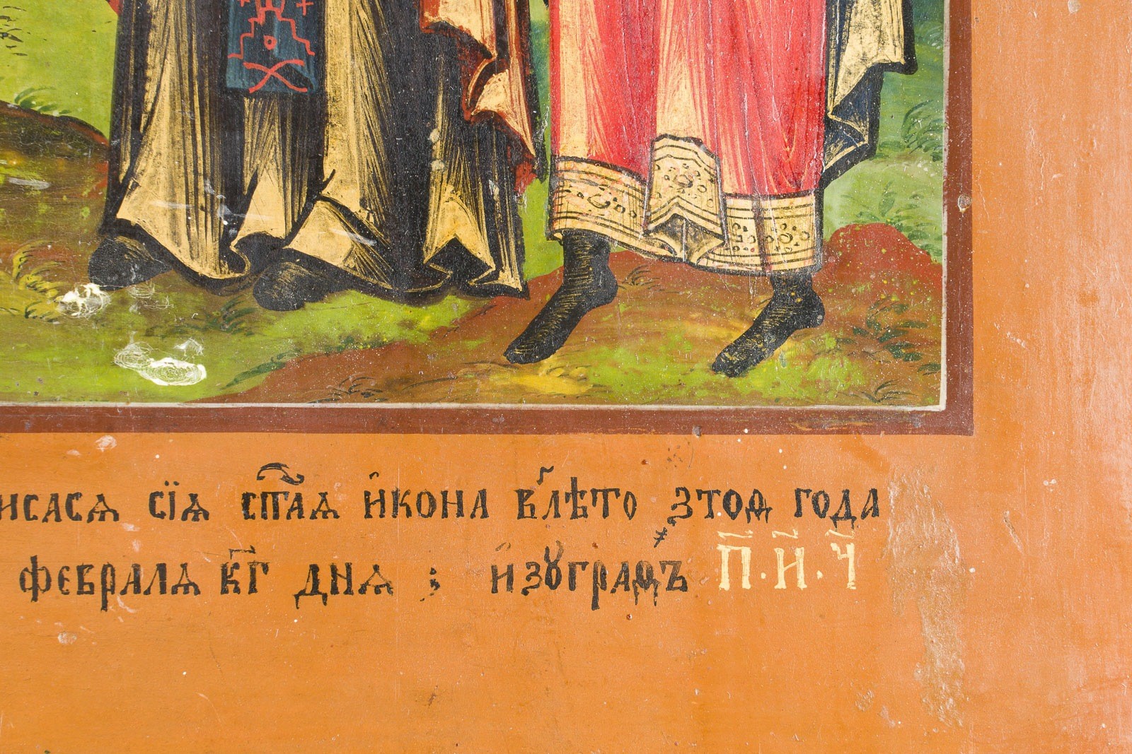 DATIERTE IKONE MIT DEM SCHUTZENGEL UND DREI HEILIGEN, DARUNTER BONIFATIUS UND MOISES