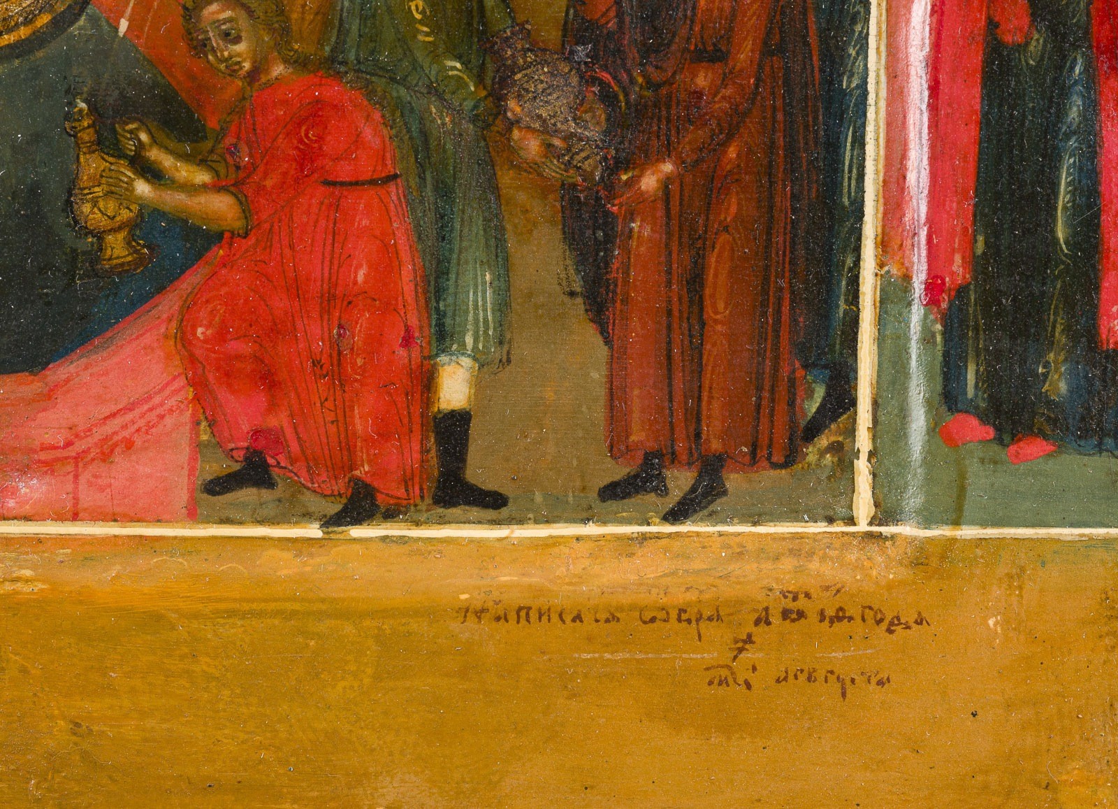 Holztafel, verso geflacht, mit zwei Rückseiten-Sponki (verloren). Kowtscheg, Eitempera auf Kreidegrund, versilberte Nimben goldfarben lasiert. 31,8 x 28 cm. Datierung am unteren rechten Rand. Sechs Randheilige, darunter Johannes der Vorläufer und die heilige Anna. Partiell rest.
