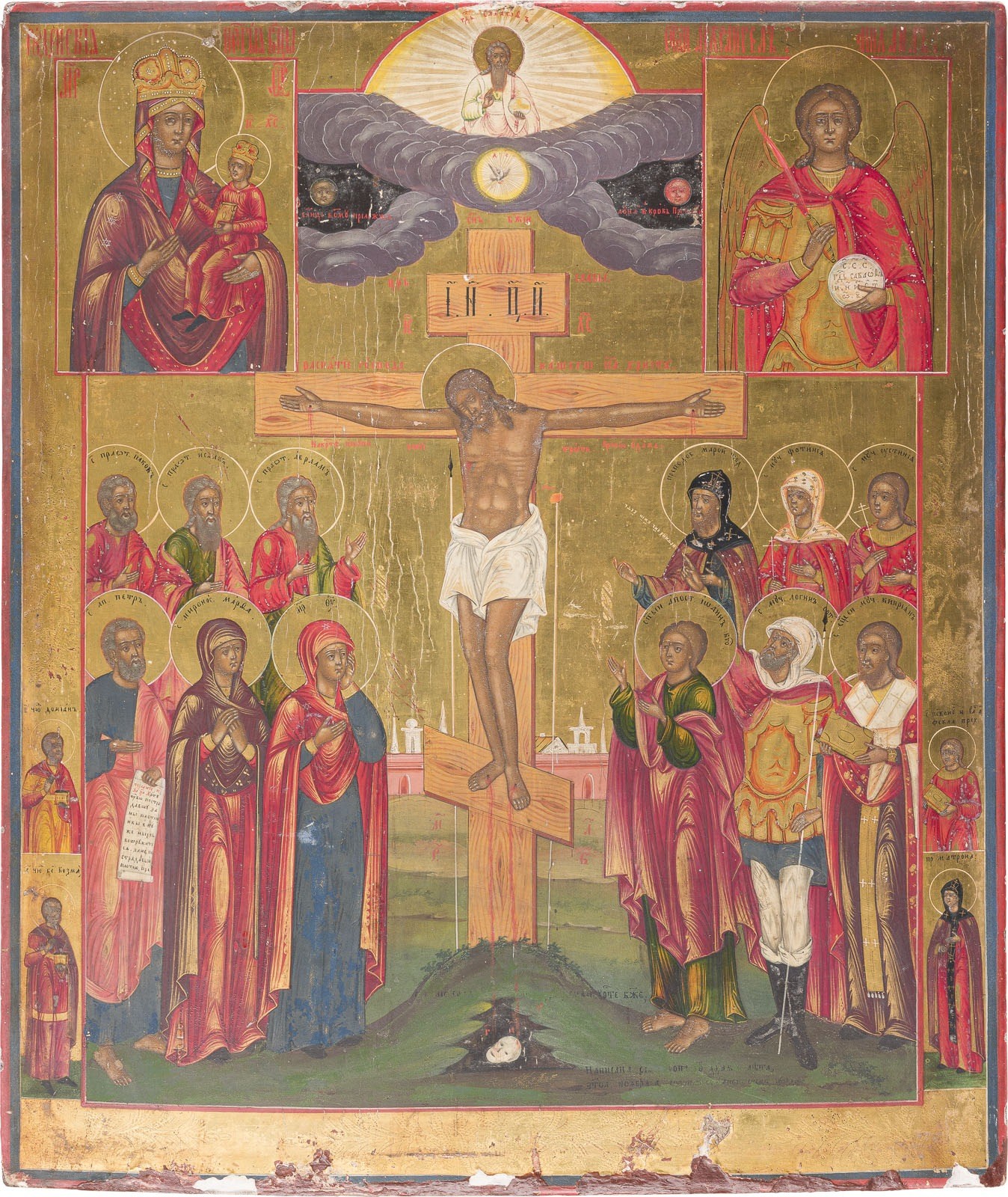 DATIERTE UND SIGNIERTE, GROSSFORMATIGE IKONE MIT DER KREUZIGUNG CHRISTI, AUSGEWÄHLTEN HEILIGEN, DER GOTTESMUTTER UND DEM ERZENGEL MICHAEL