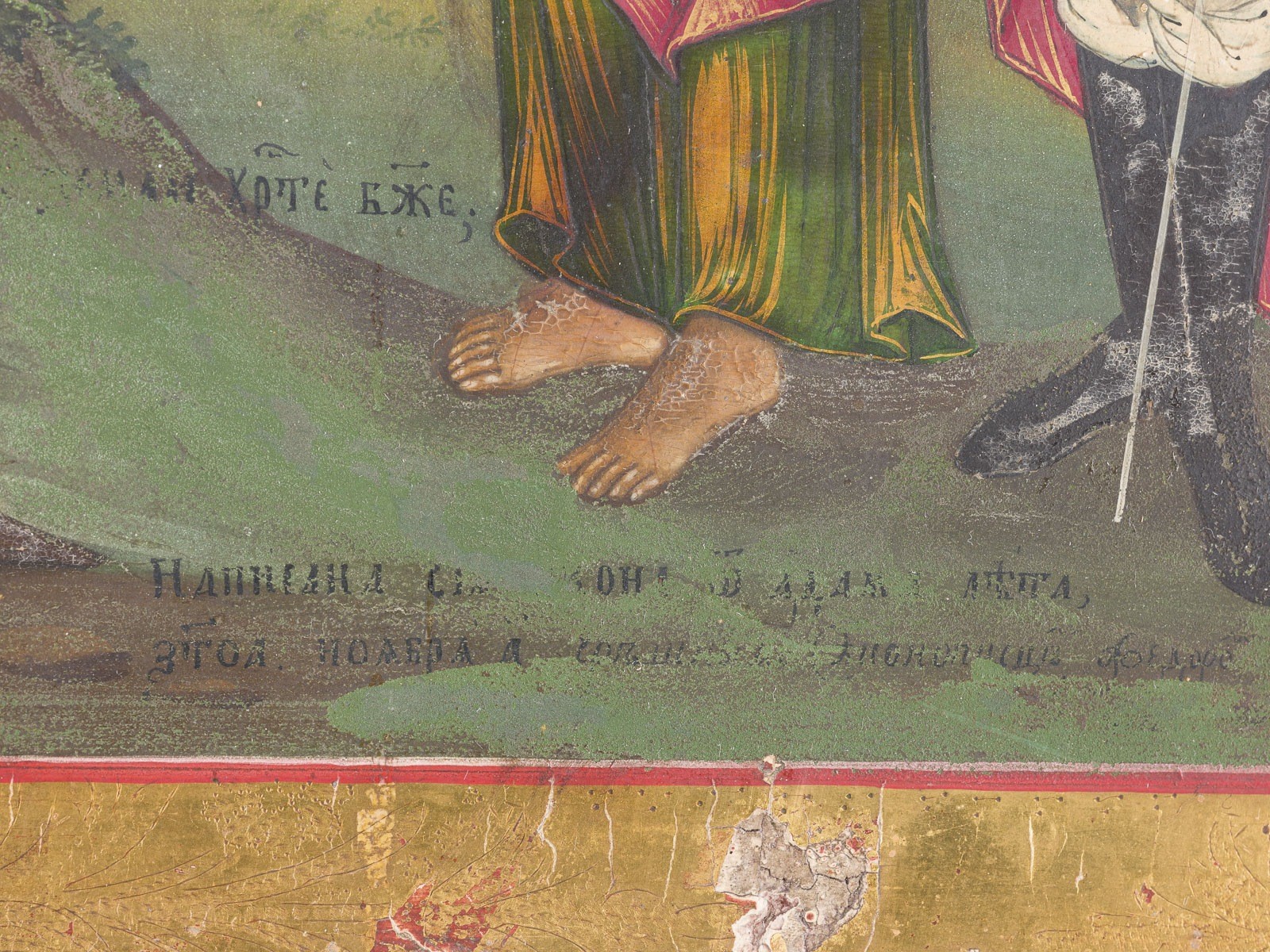 Verbund von vier Laubholz-Brettern mit zwei Rückseiten-Sponki. Eitempera auf Kreidegrund, Goldgrund, ornamentale Punzierung des Randes. 53,2 x 45,4 cm. Am unteren Rand kyrillische Signatur und Datierung: 'Diese heilige Ikone wurde im Jahr 7371 von Adam (1862) am 1. November von dem sündigen Ikonenmaler Feodor gemalt'. Vier Randheilige, darunter die Heiligen Thekla und Matrona. Kleinere Substanzverluste im Randbereich.
