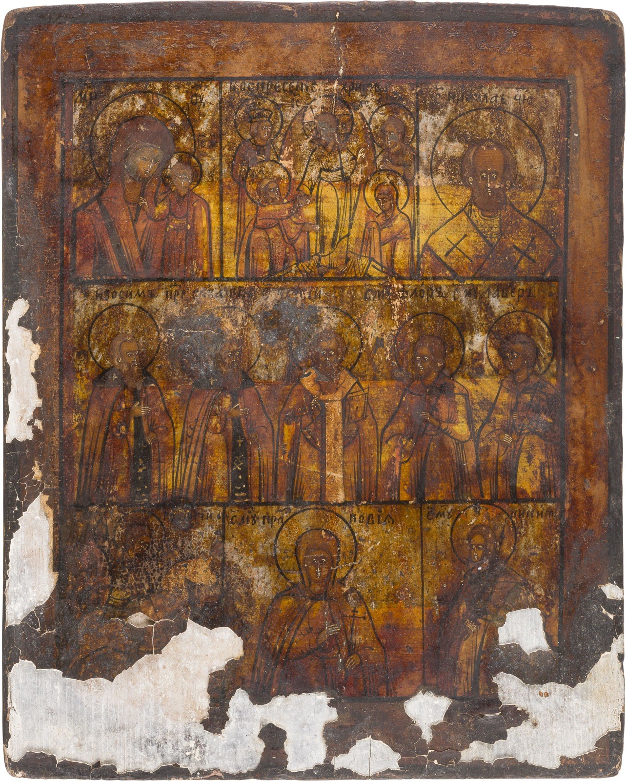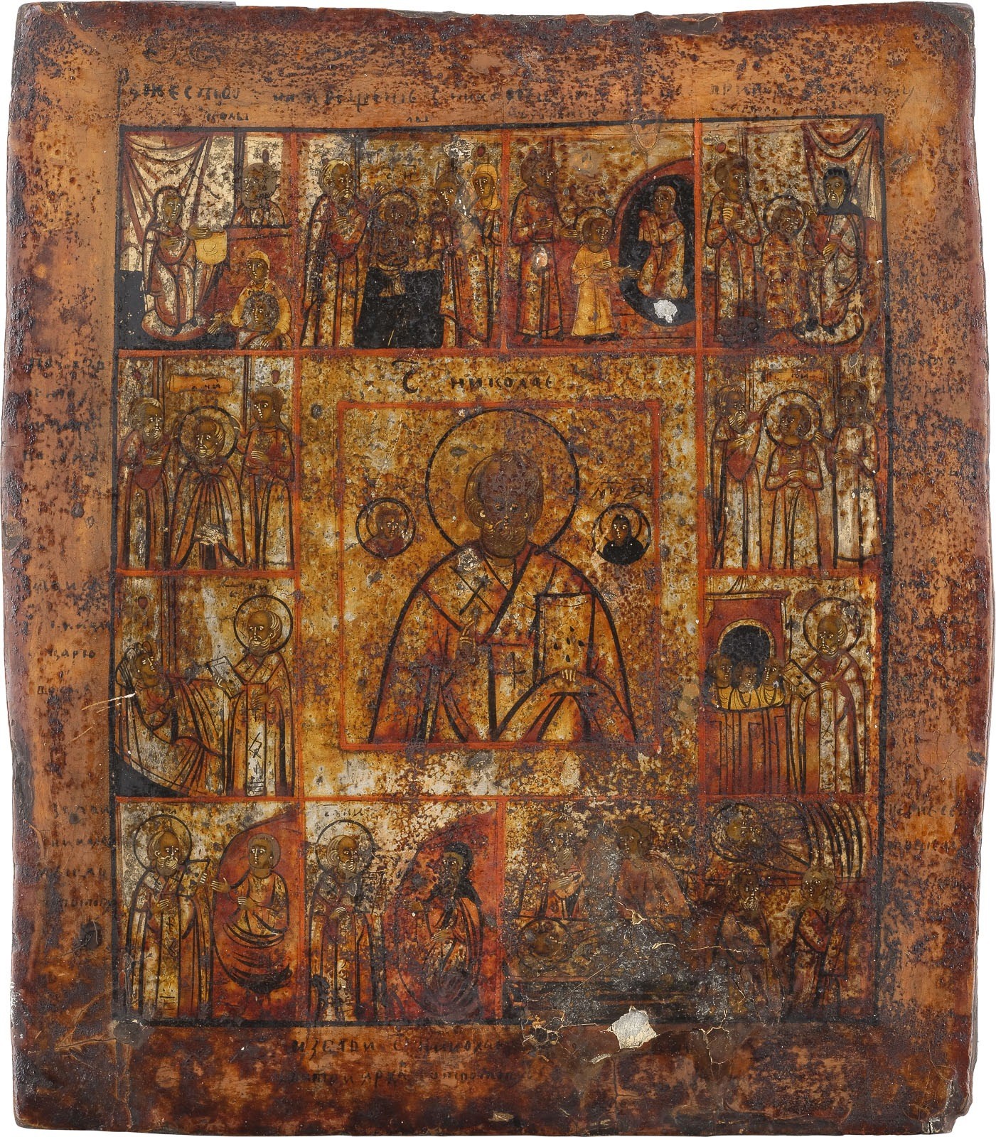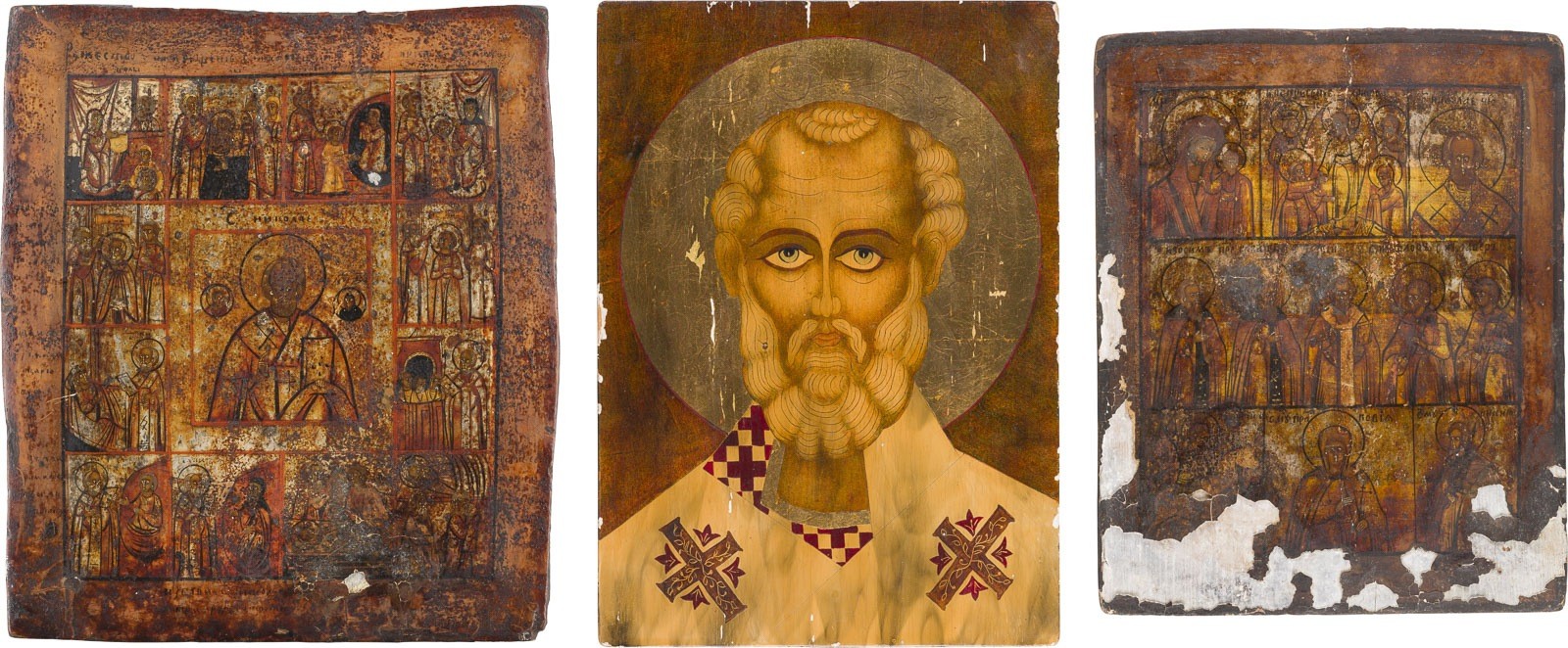 DREI IKONEN: MEHRFELDER-IKONE, VITA-IKONE MIT DEM HEILIGEN NIKOLAUS VON MYRA UND HEILIGER NIKOLAUS