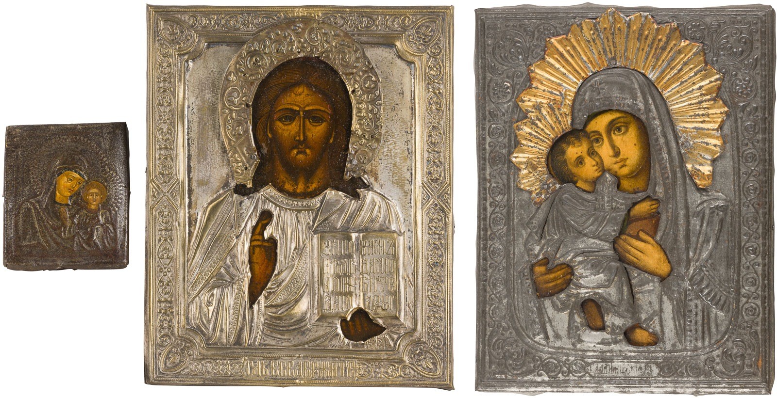 DREI IKONEN MIT OKLAD: GNADENBILDER DER GOTTESMUTTER UND CHRISTUS PANTOKRATOR