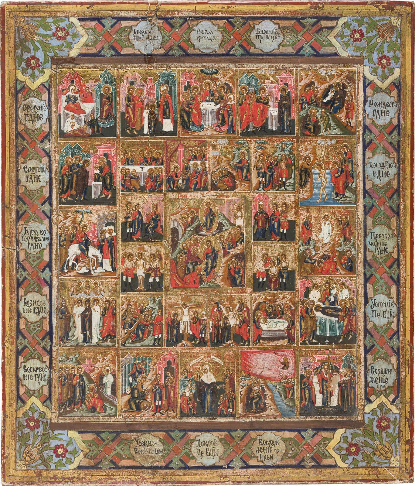 ERWEITERTE FESTTAGSIKONE MIT DEM PASSIONSZYKLUS UND 16 HOCHFESTEN DES ORTHODOXEN KIRCHENJAHRES