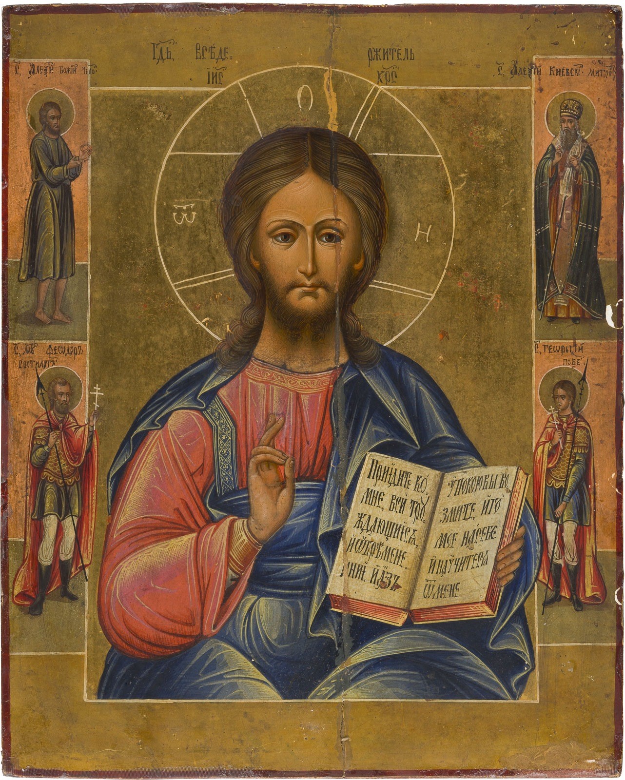 Verbund zweier Bretter mit zwei Rückseiten-Sponki (Verloren). Eitempera auf Kreidegrund, Hintergrund und Nimben vergoldet. Messingoklad mit Reliefdekor. 33,2 x 27 cm. Vier Randheilige, darunter die Heiligen Theodor und Georg. Vertikaler Riss rest., Kanten best.