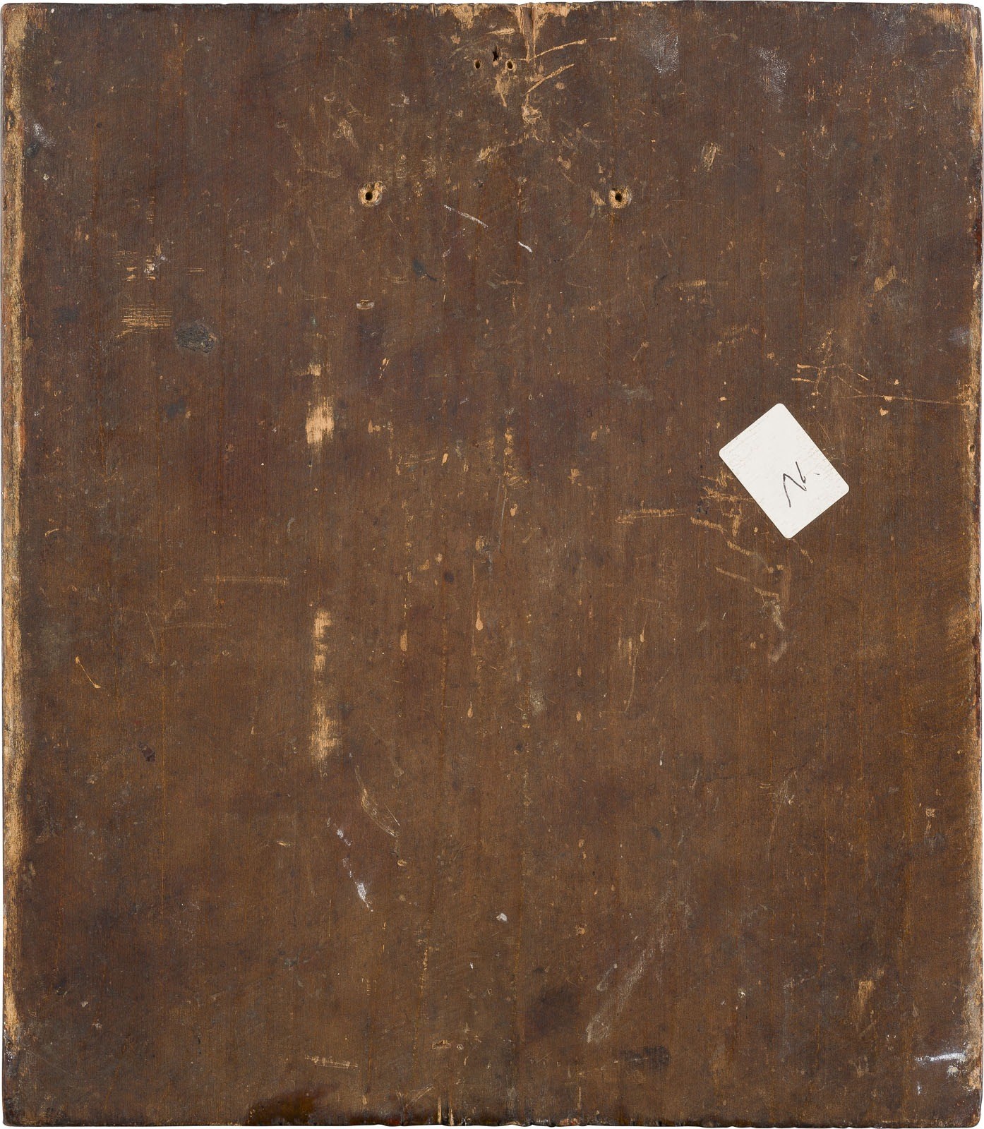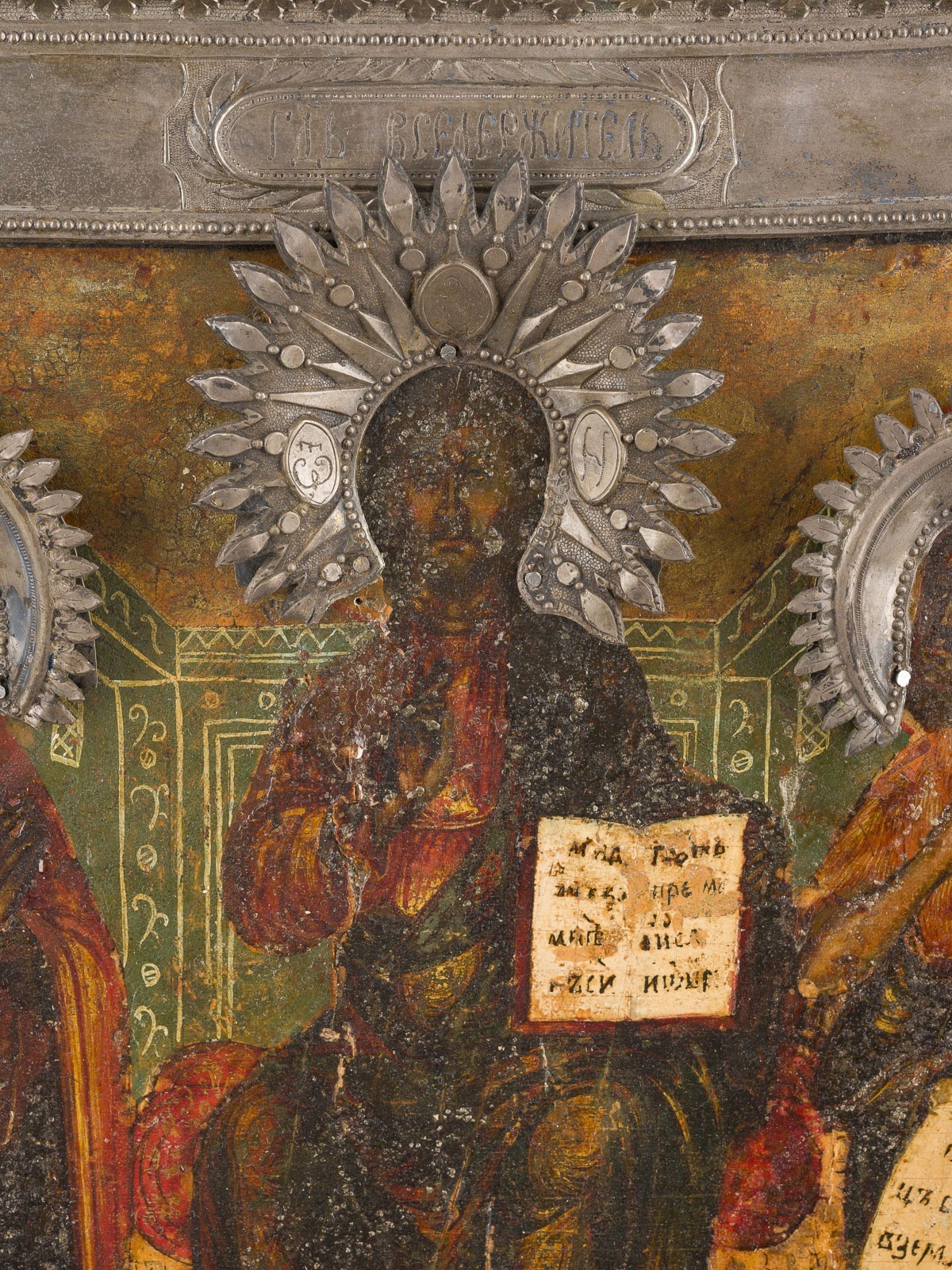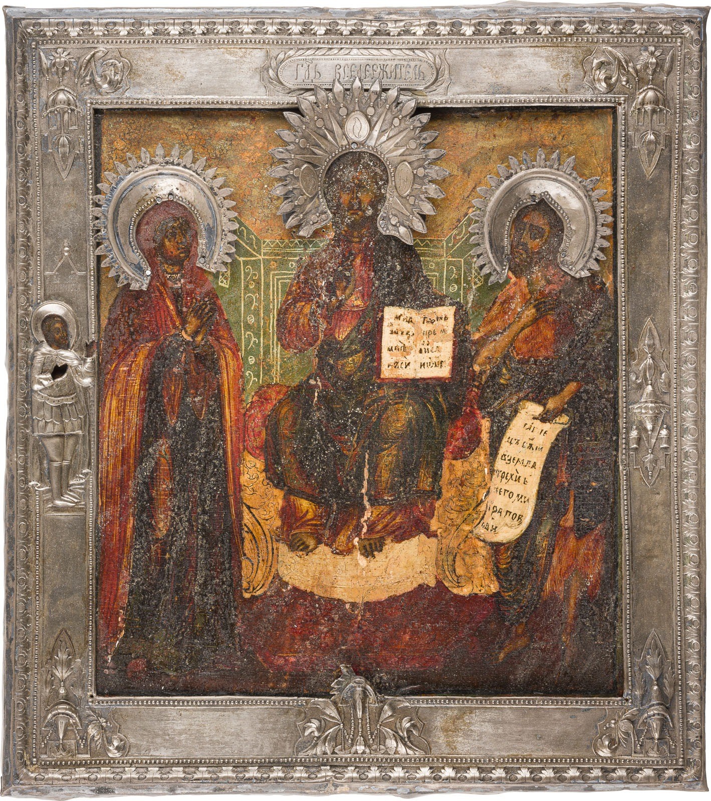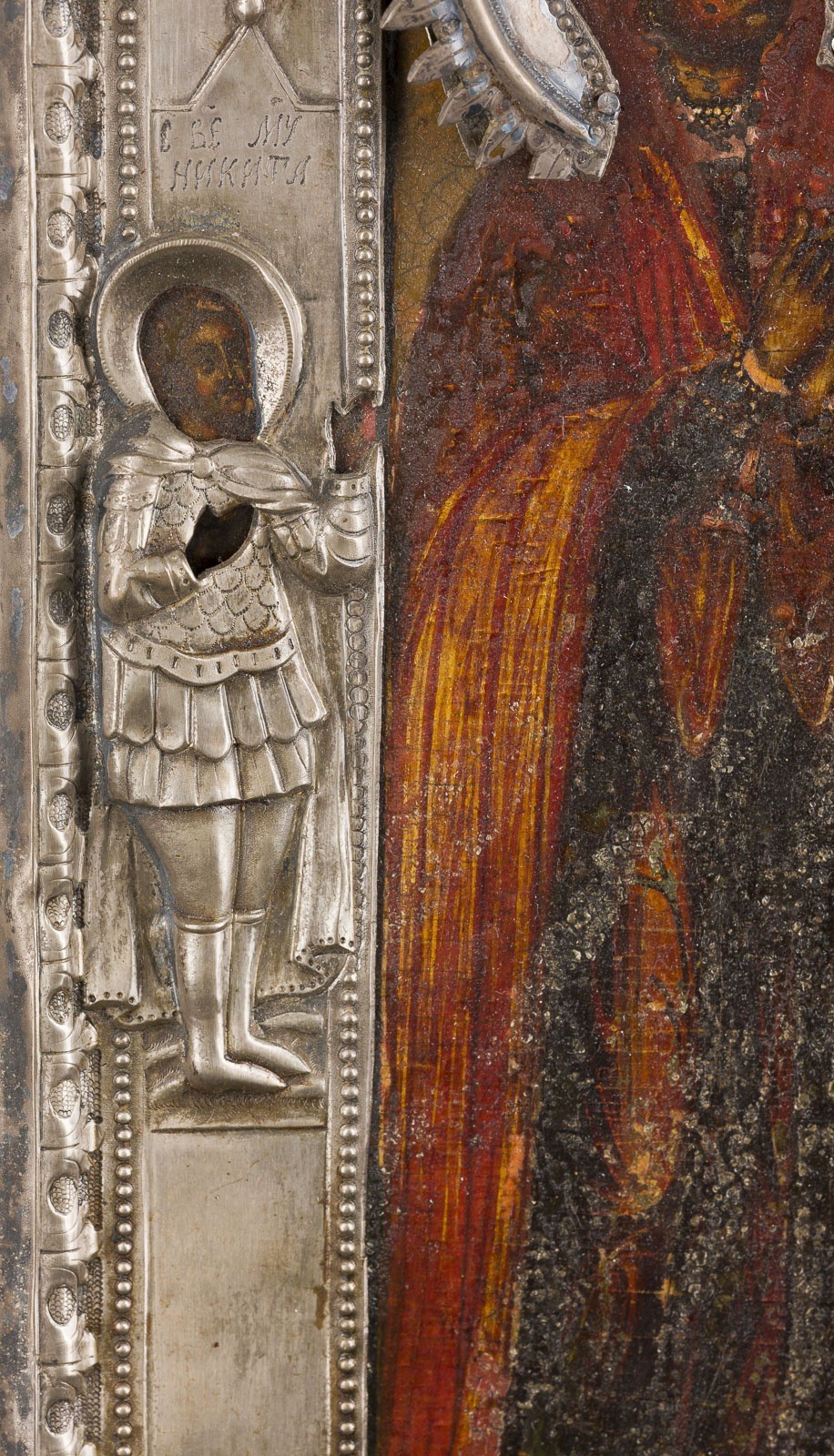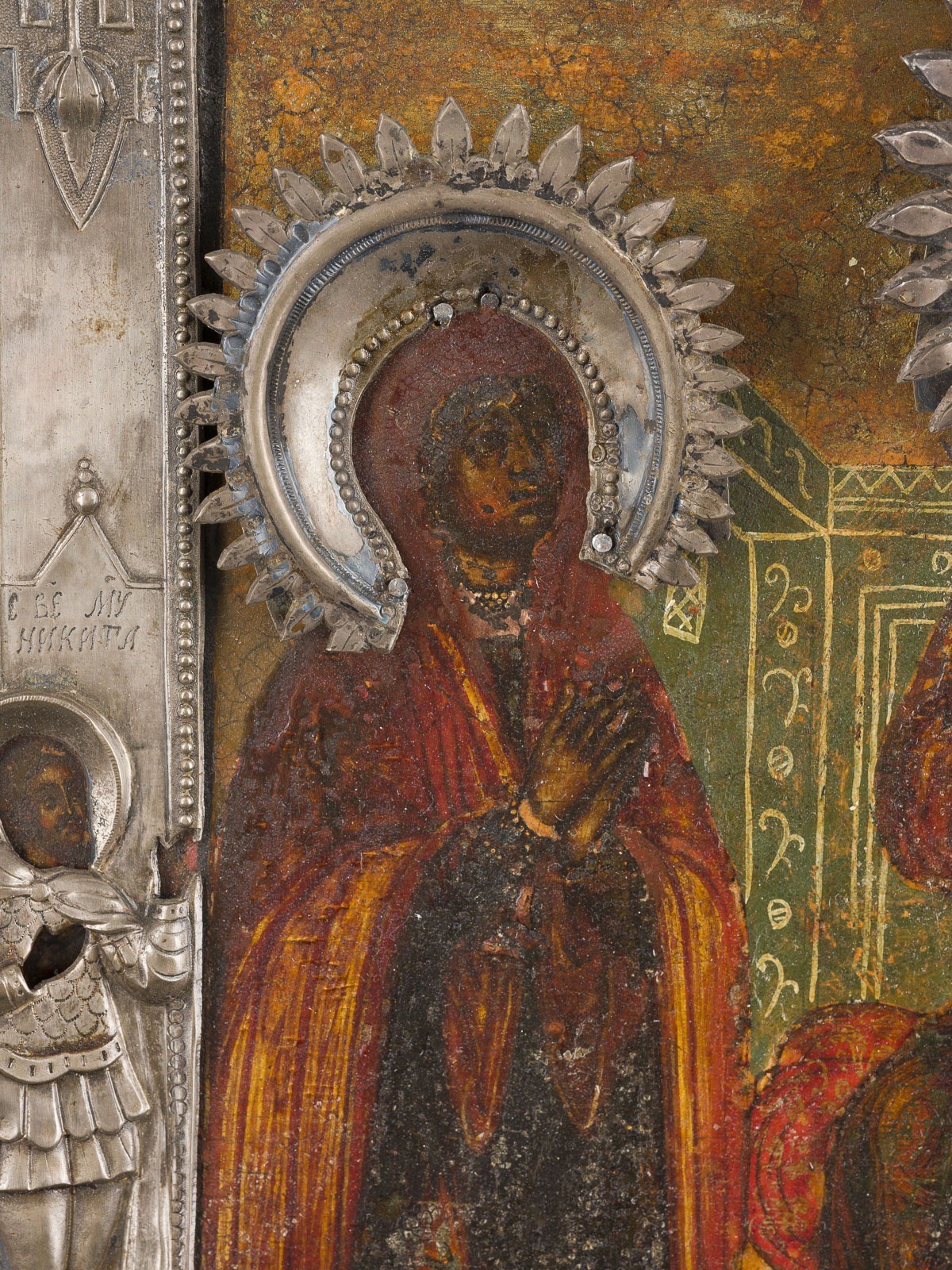 Einzeltafel mit zwei Stirnseiten-Sponki. Eitempera auf Kreidegrund, Gewandfalten in Goldassist. Silber, getrieben und ziseliert. 31,2 x 28 cm. Punziert mit Stadtmarke, Beschaumeisterzeichen, Meistermarke 'PS' in Kyrillisch und Feingehalt '84'. Auf dem linken Rand erscheint der heilige Nikita. Farbaufwölbungen, Restaurierungen.