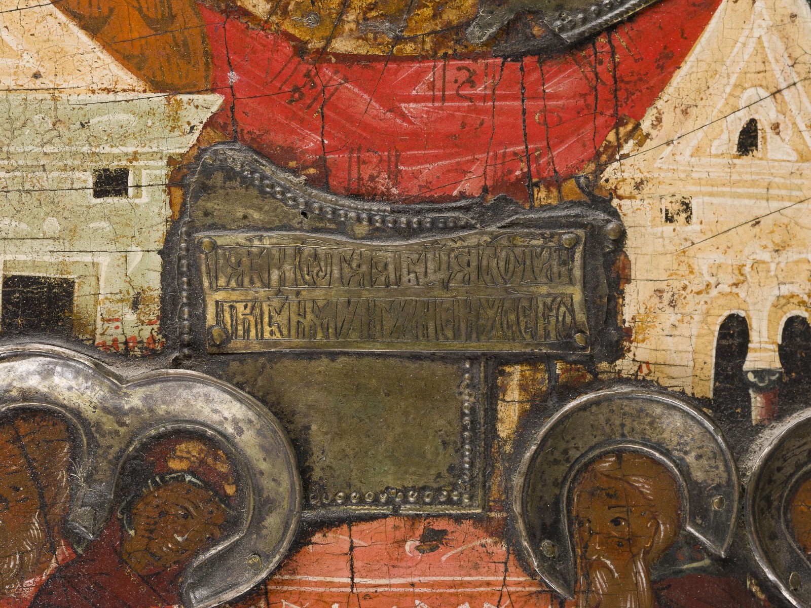 Holztafel mit zwei Rückseiten-Sponki. Kowtscheg, Eitempera auf Kreidegrund. Metallbasma mit punziertem Dekor. 31,4 x 26,6 cm. Kleinere Substanzverluste.