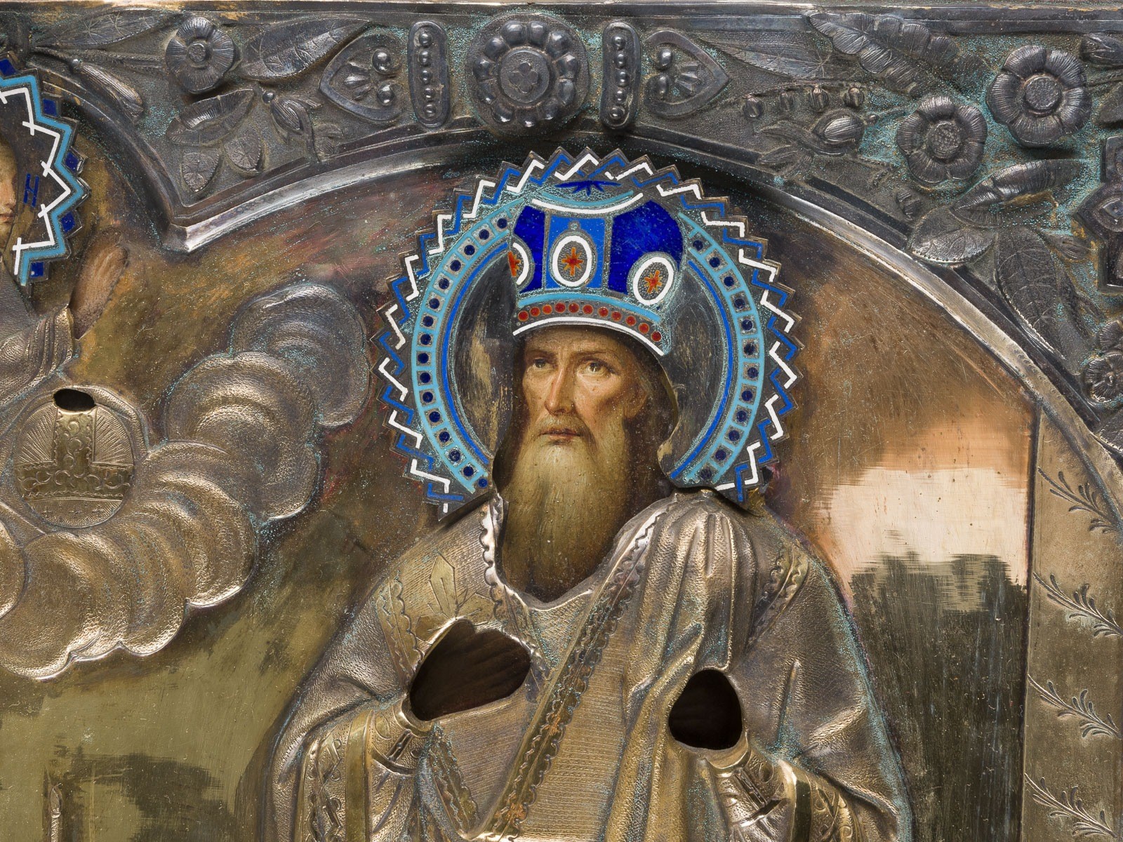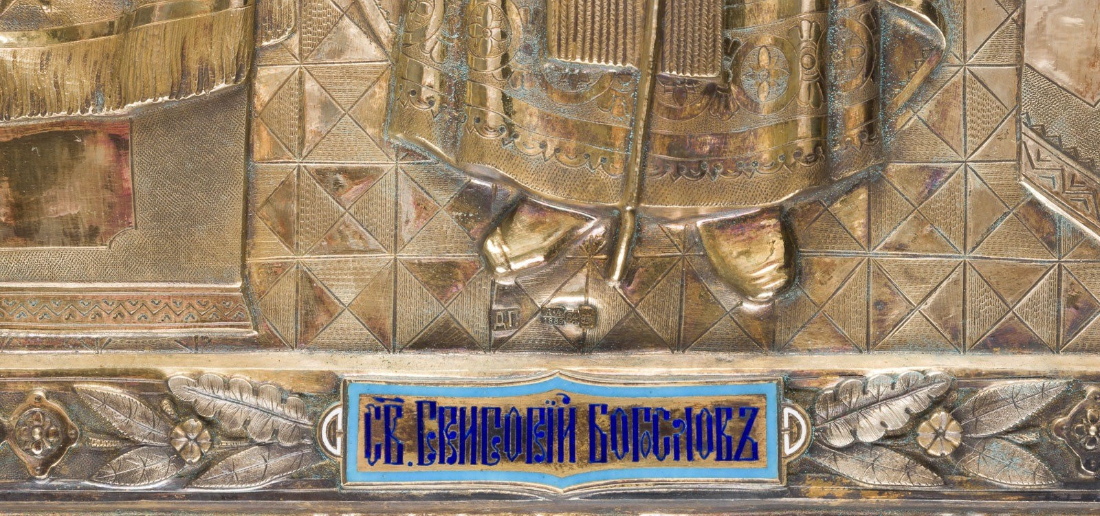 Holztafel, verso Seidenabdeckung. Ölmalerei. Oklad aus vergoldetem Silber. Namenstitulus und Nimben in Champlevé-Email. 31,2 x 26,5 cm / 56 x 36 cm (mit verglastem Kiot). Punziert mit Stadtmarke, Beschaumeisterzeichen, Feingehalt '84' und Meistermarke 'DG' in Kyrillisch. Rückseitig kyrillisches Klebeetikett 'Aus dem Geschäft von W.W. Demidow'.