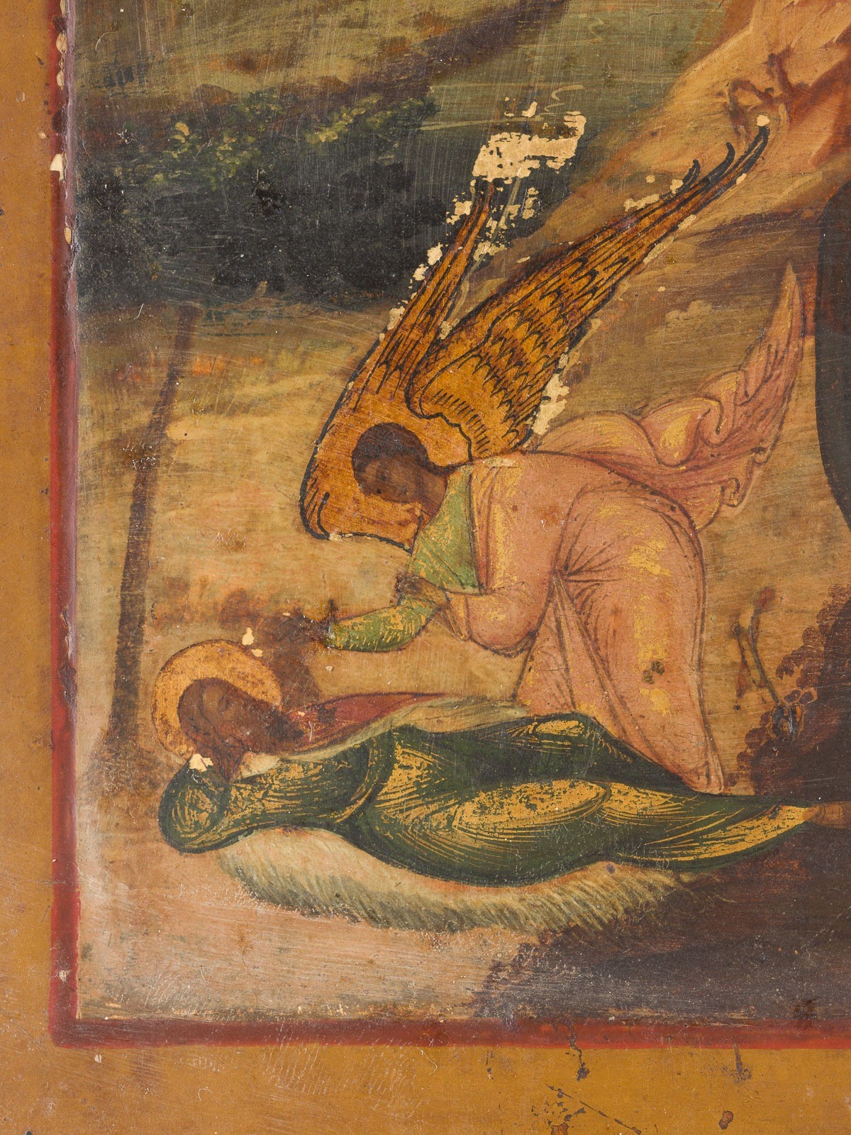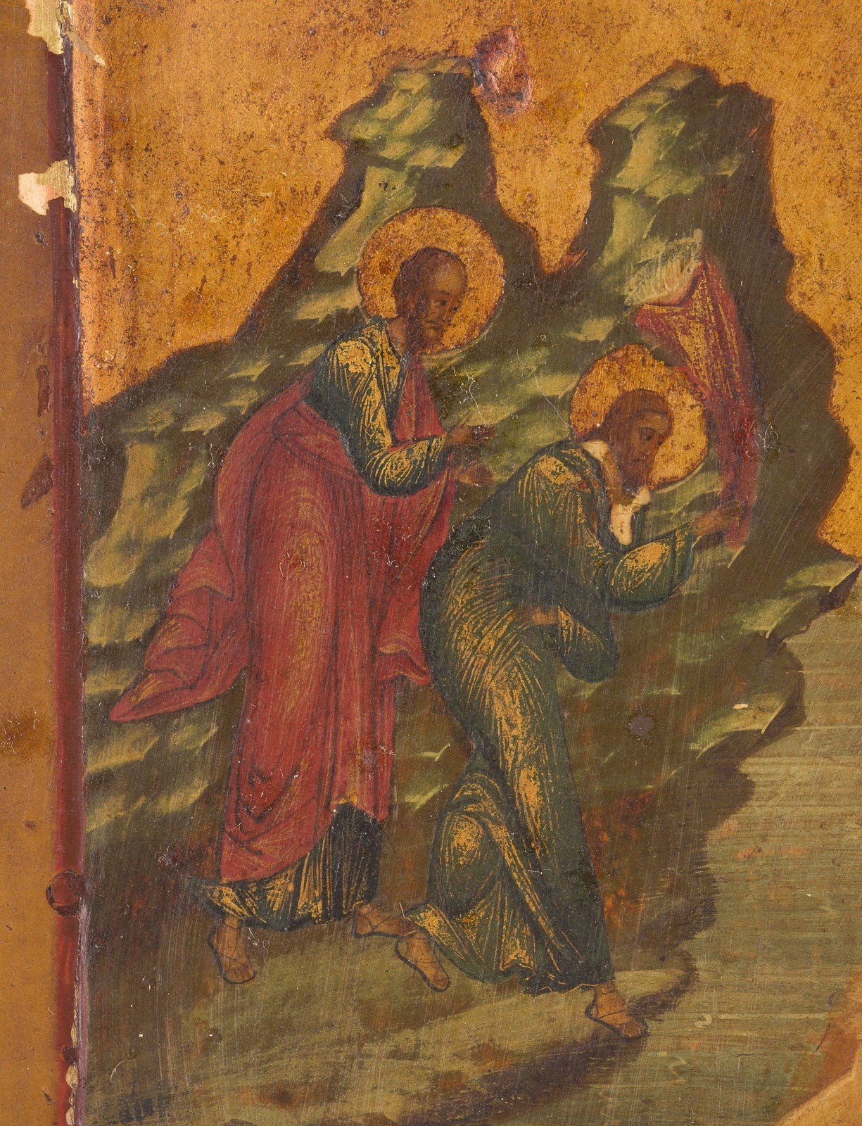 Einzeltafel mit zwei profilierten Rückseiten-Sponki. Kowtscheg, Eitempera auf Kreidegrund, Goldgrund, Chrysographie. 30,7 x 26,5 cm. Min. vertikale Rissbildung, min. Farbverluste.
