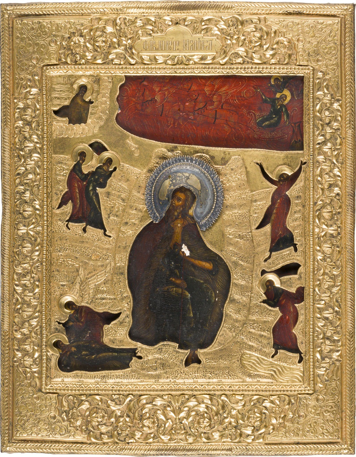 FEINE IKONE MIT DEM PROPHETEN ELIAS, SEINEM LEBEN IN DER WÜSTE UND SEINER FEURIGEN HIMMELFAHRT MIT RIZA