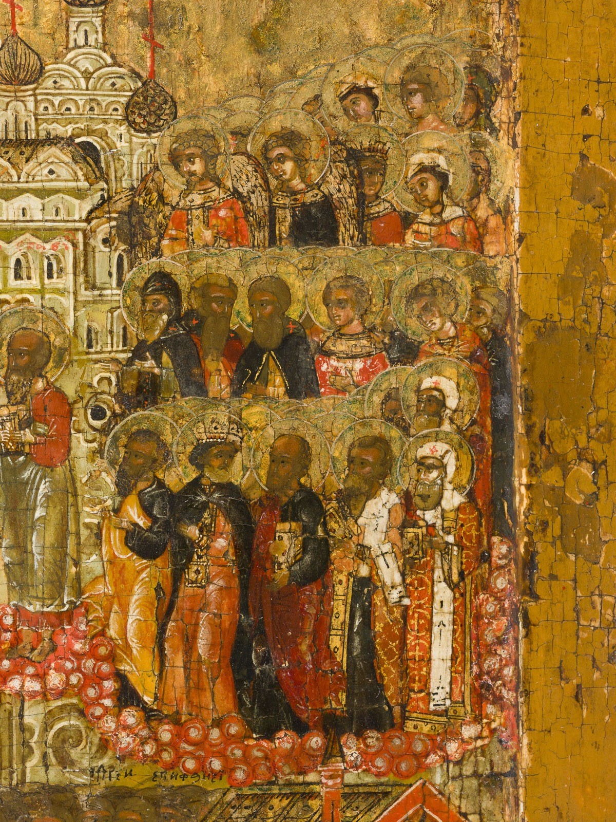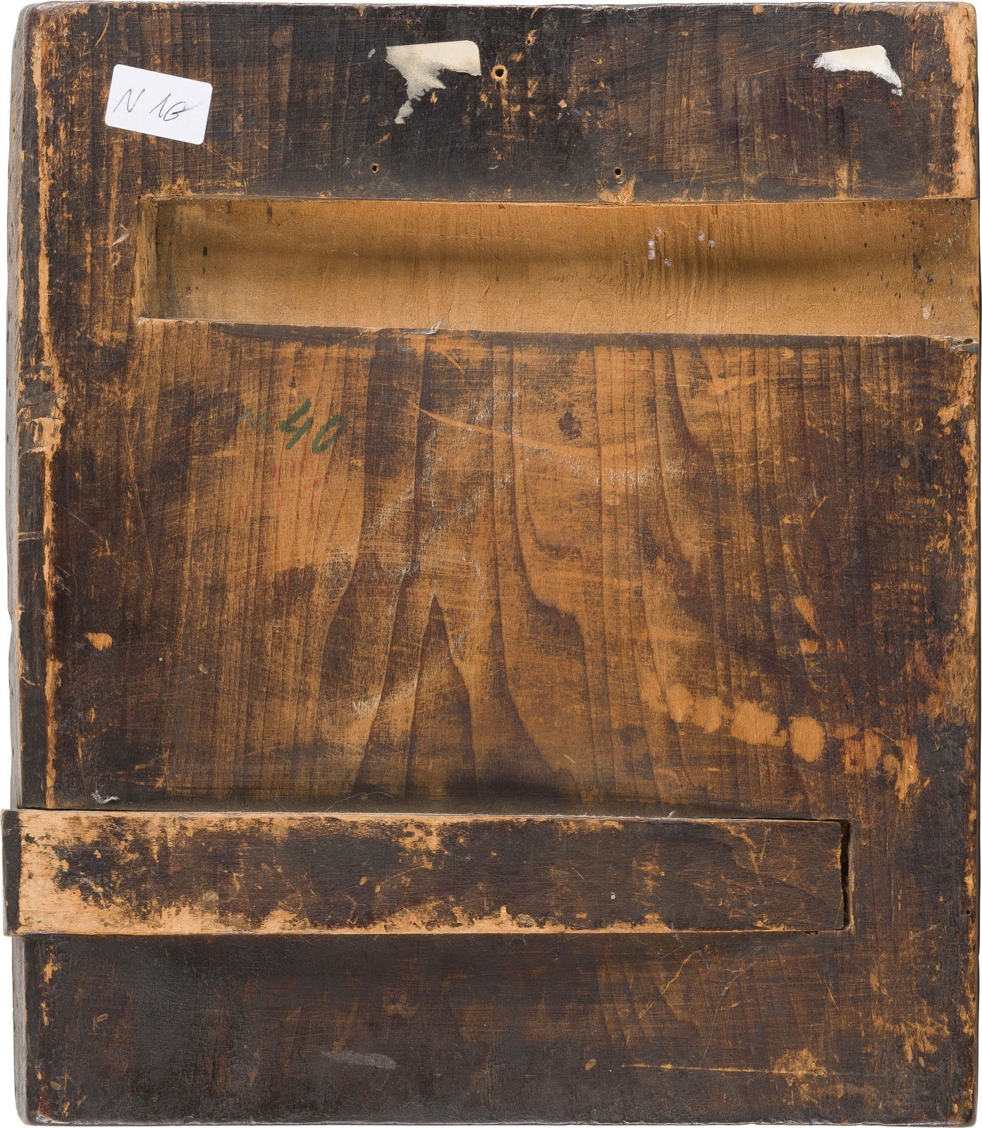 Einzeltafel mit zwei Rückseiten-Sponki (einer verloren). Doppeltes Kowtscheg, Eitempera auf Kreidegrund, Goldgrund. 32,8 x 28,4 cm. Ränder teils besch. und rest., Einstimmungen.