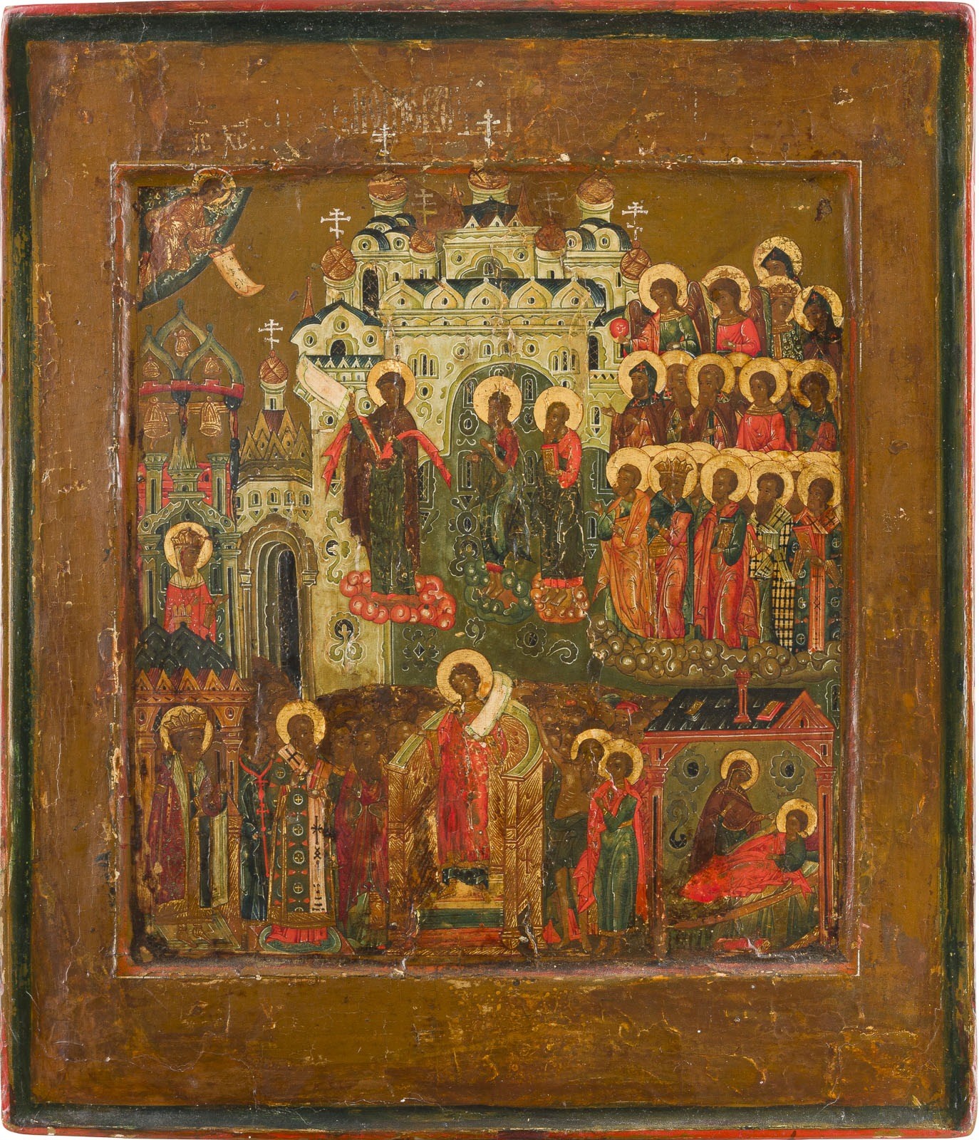 Einzeltafel mit zwei Rückseiten-Sponki (verloren). Doppeltes Kowtscheg, Eitempera auf Kreidegrund, Nimben vergoldet. 31 x 27 cm. Restaurierungen.
