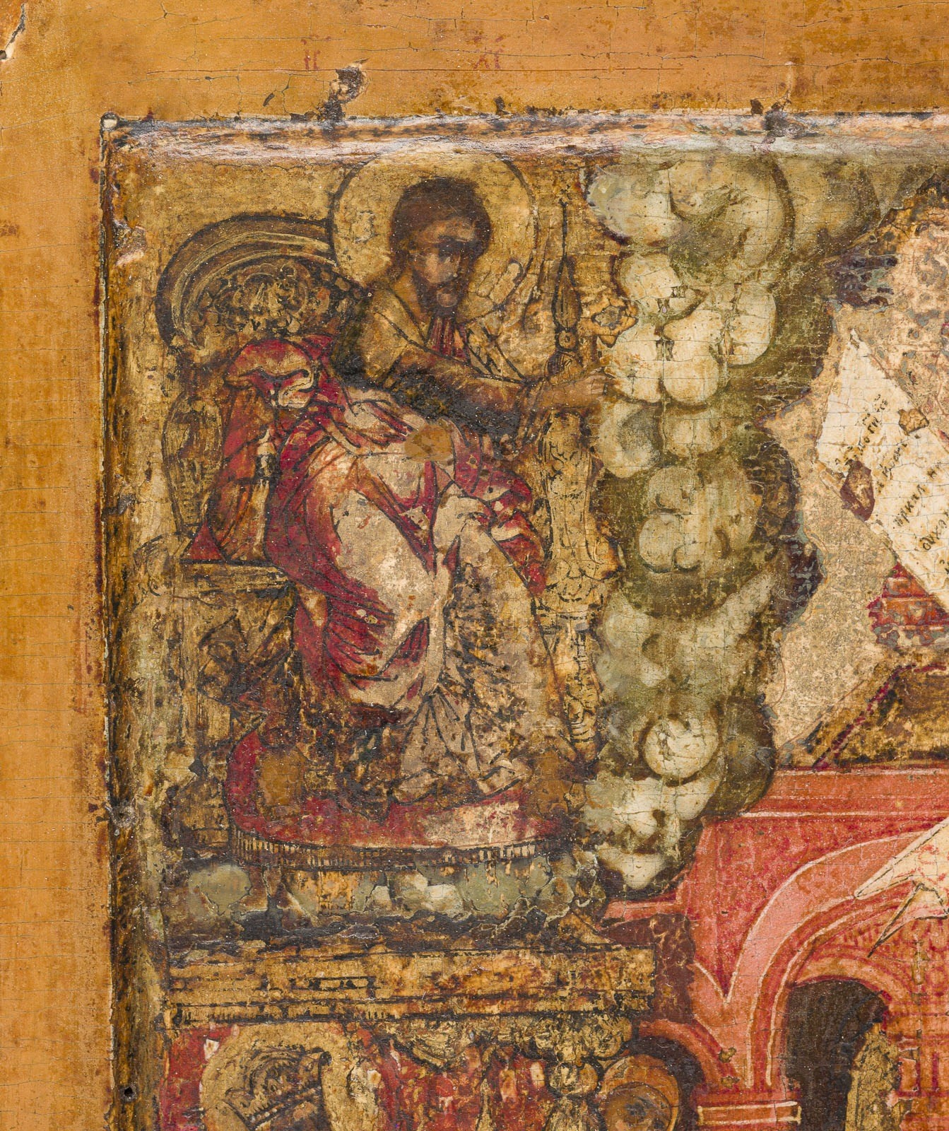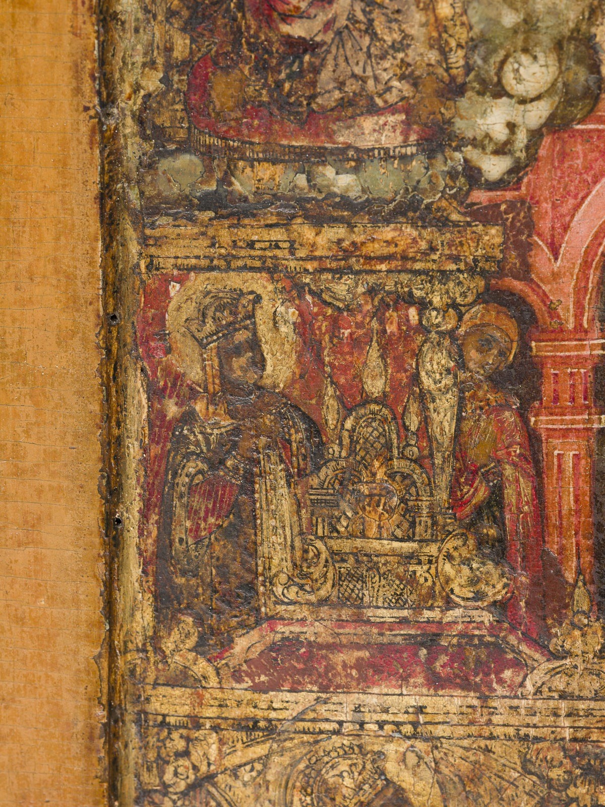 Einzeltafel mit zwei Rückseiten-Sponki. Doppeltes Kowtscheg, Eitempera auf Kreidegrund, Nimben vergoldet. 30,8 x 27,2 cm. Detailreiche Ausarbeitung der Szene. Die in dunkler Farbigkeit ausgeführten Gewänder