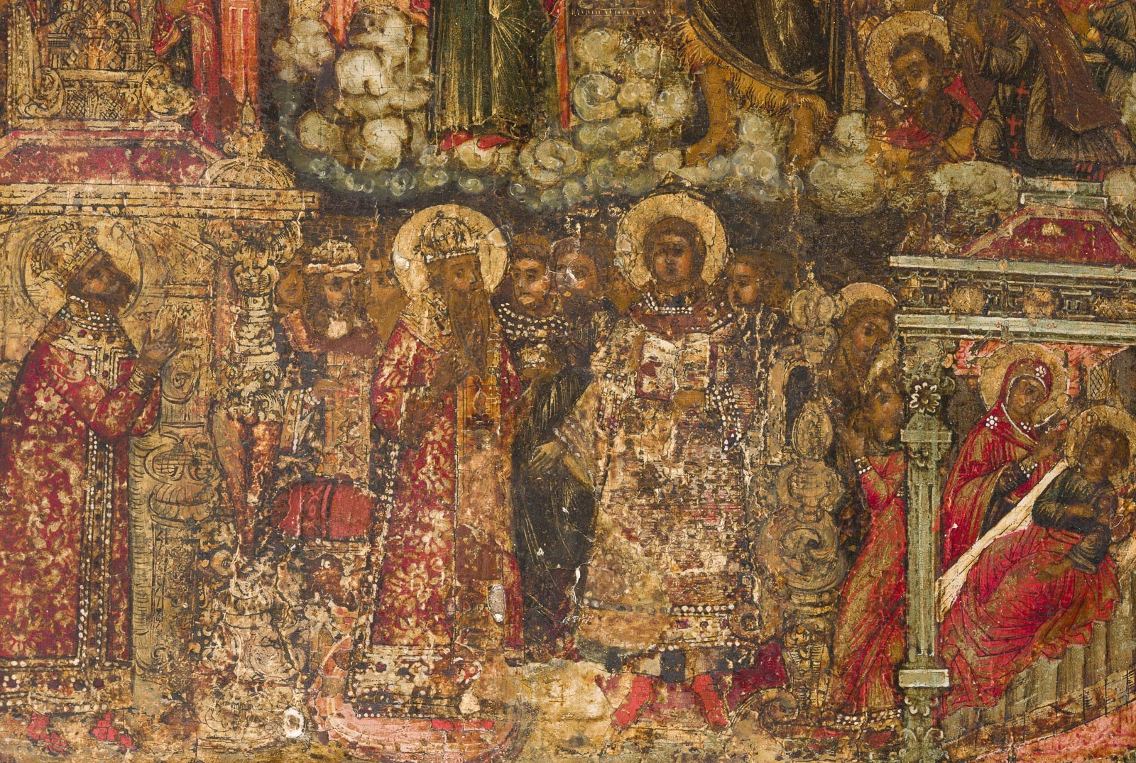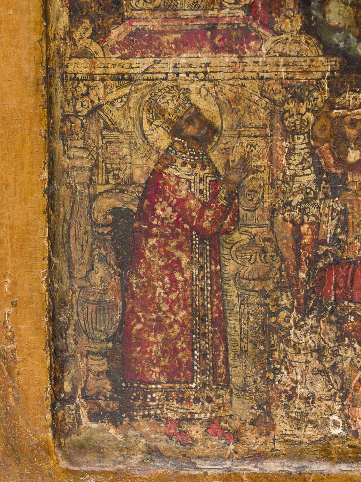 zieren Falten in Goldmalerei und Perlbesatz. Partiell rest.