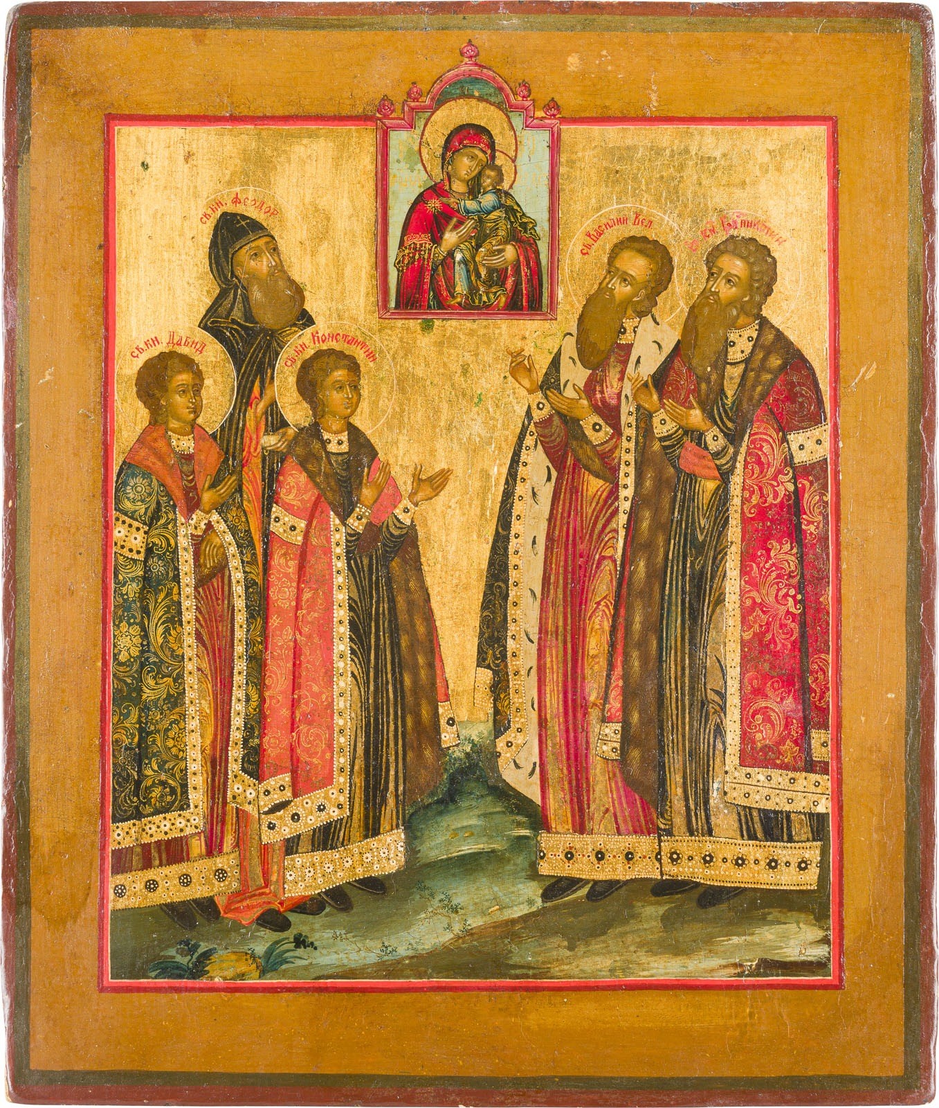 FEINE IKONE MIT DEN HEILIGEN VON JAROSLAWL: DIE FÜRSTEN DAVID, THEODOR, KONSTANTIN, WASILIJ UND KONSTANTIN