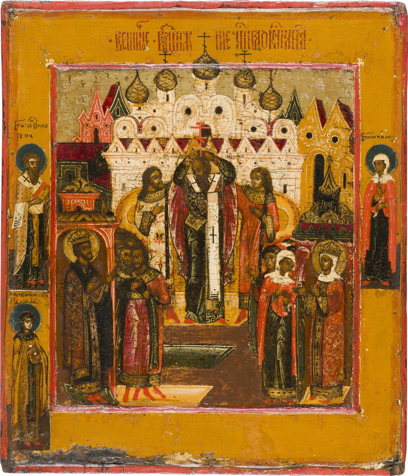Einzeltafel mit zwei Rückseiten-Sponki. Doppeltes Kowtscheg, Eitempera auf Kreidegrund, partielle Vergoldung. 31,3 x 27 cm. Drei Randheilige. Partiell rest., kleinere Substanzverluste im unteren Randbereich.
