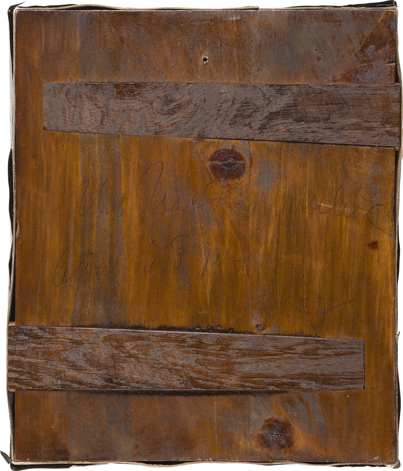 Verbund zweier Bretter mit zwei Rückseiten-Sponki. Eitempera auf Kreidegrund, Nimben und Gewandfalten vergoldet. Oklad aus vergoldetem Silber mit reichem Reliefdekor. 31,5 x 27,3 cm. Punziert mit Stadtmarke, Feingehalt '84' und Meisterzeichen. Min. berieben.