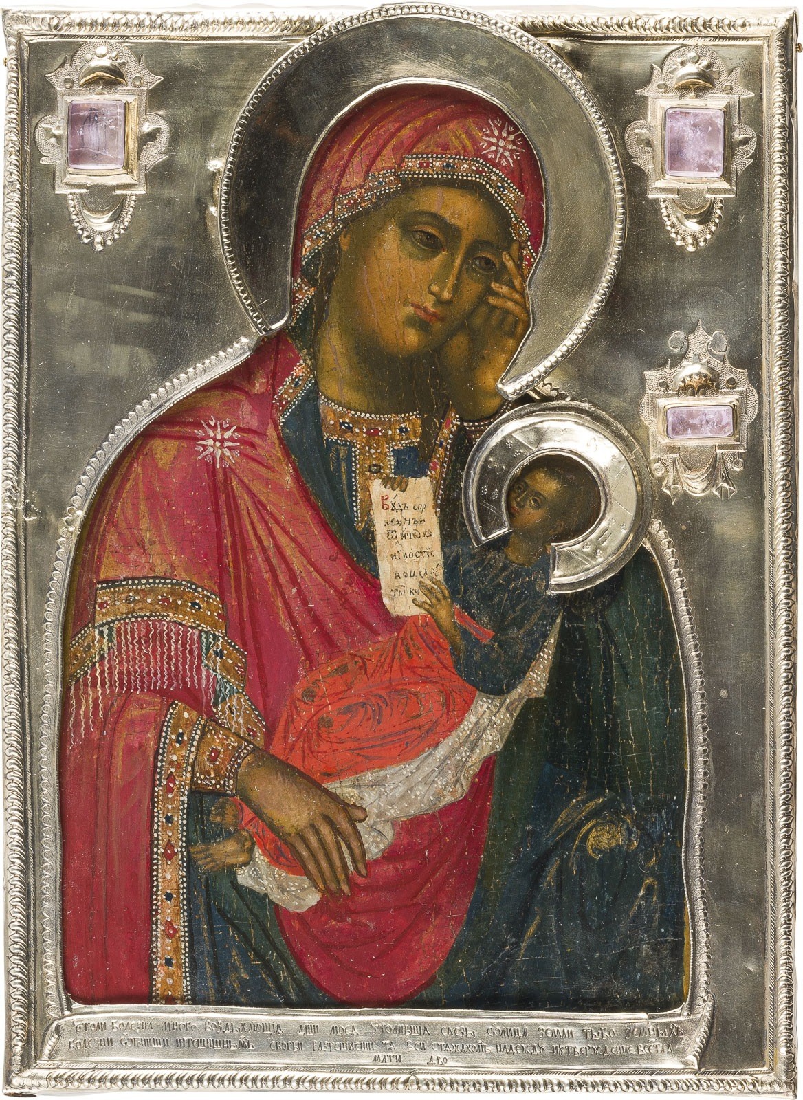 Holztafel, verso Seidenabdeckung. Eitempera auf Kreidegrund. Riza aus vergoldetem Silber, Amethystbesatz. 30 x 22 cm. Punziert mit Stadtmarke, Beschaumeisterzeichen und Meistermarke 'NN' in Kyrillisch. Partiell rest.