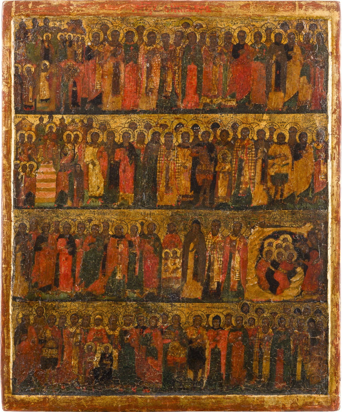 Einzeltafel mit zwei Rückseiten-Sponki. Kowtscheg, Eitempera auf Kreidegrund, Goldgrund. 32,7 x 27,2 cm. Restaurierungen.