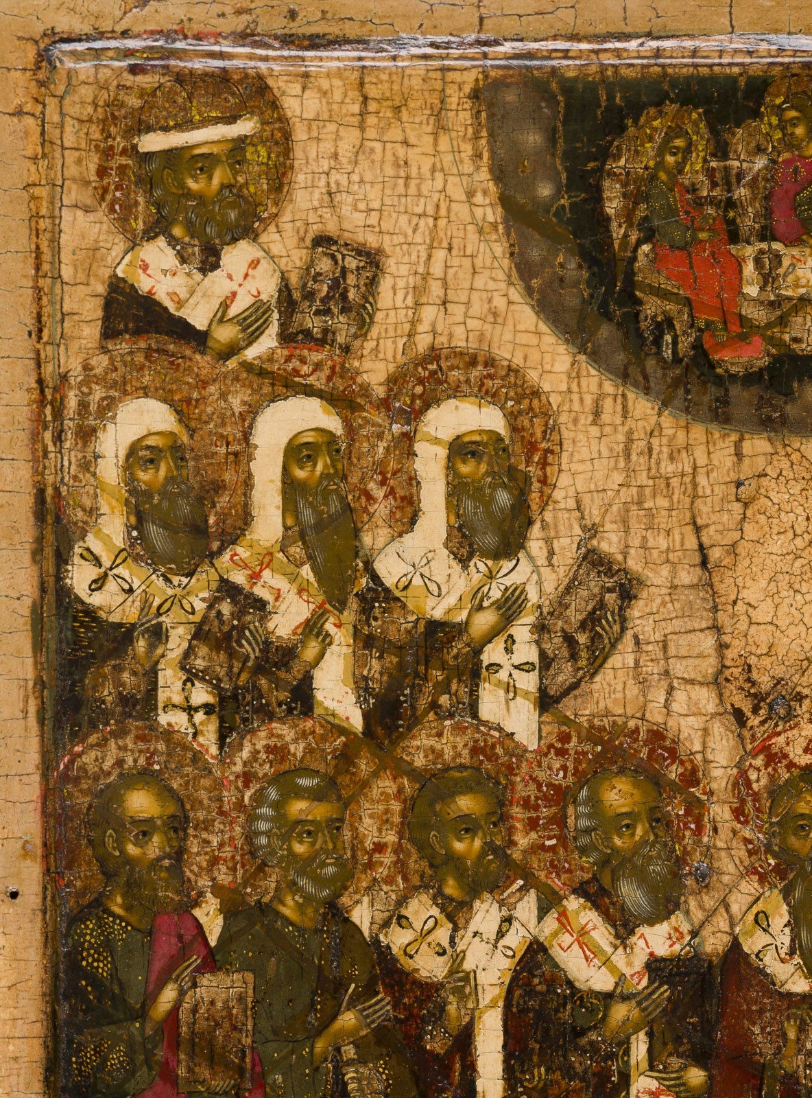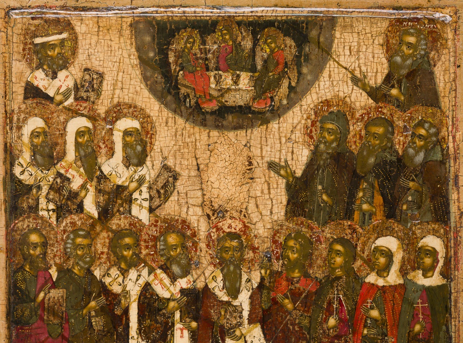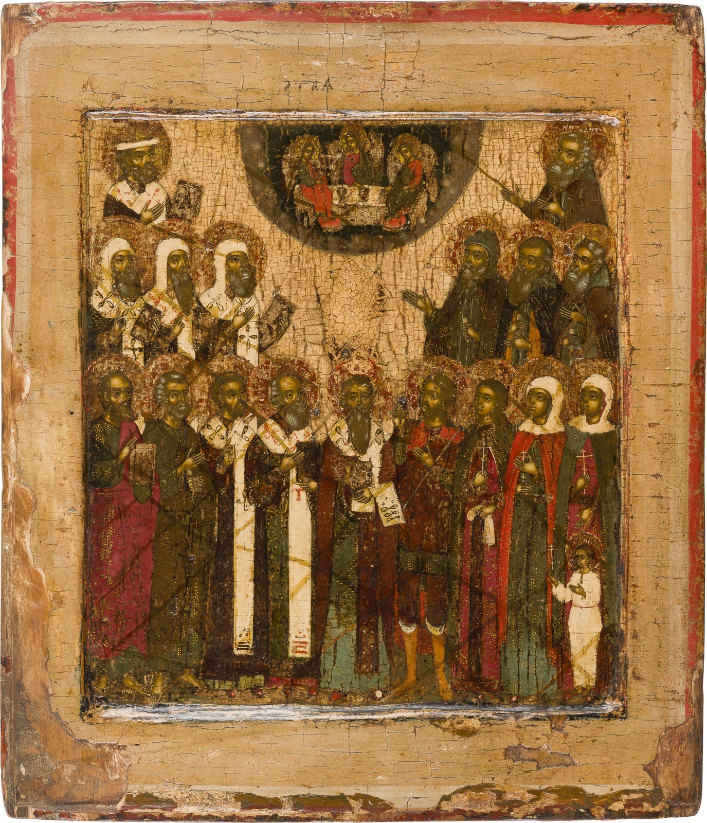 Einzeltafel mit zwei Rückseiten-Sponki. Doppeltes Kowtscheg, Eitempera auf Kreidegrund, Goldornamentierung der Gewänder. 30,5 x 26,8 cm. Unter den Heiligen befinden sich die Moskauer Metropoliten, die Apostel Petrus und Paulus,
