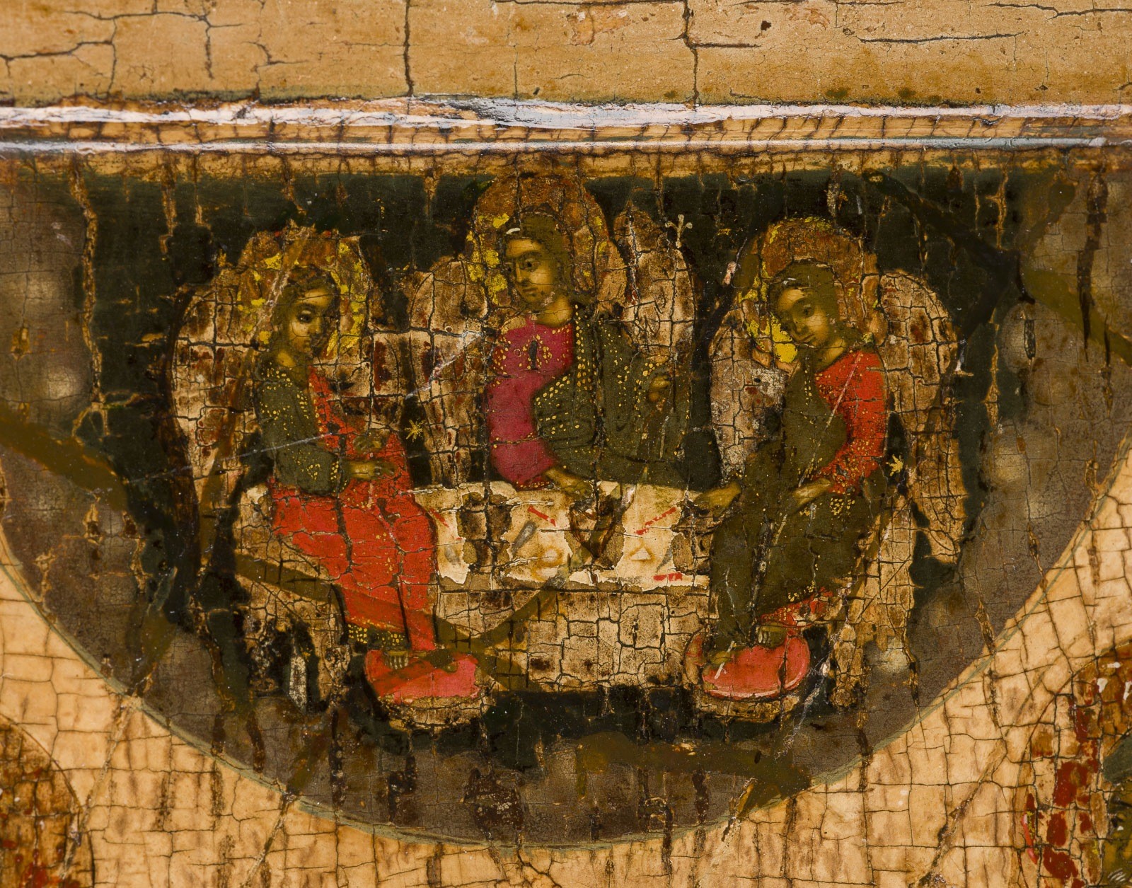 in Brauntönen mit Modellierungen in Rot. Farbe des Hintergrundes abgenommen, partiell rest.