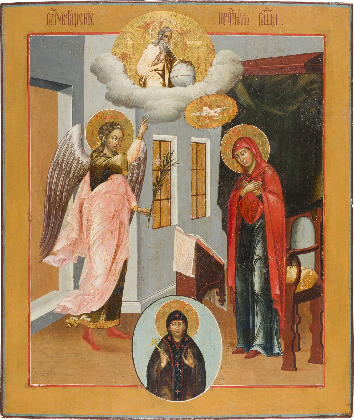 FEINE UND GROSSE IKONE MIT DER VERKÜNDIGUNG UND DER HEILIGEN EUDOKIA