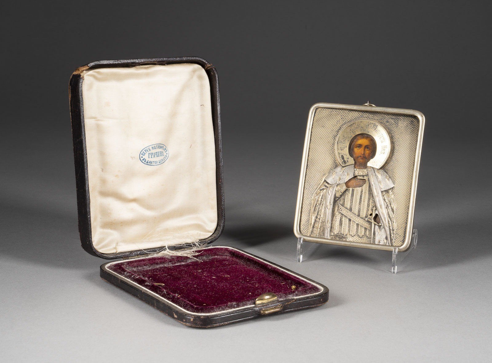 Holztafel, verso Samtabdeckung. Ölmalerei auf Metall. Oklad aus vergoldetem Silber mit getriebenem und ziseliertem Dekor. 11,2 x 9,2 cm. Punziert mit Stadtmarke, Beschaumeisterzeichen, Feingehalt '84' und Meistermarke 'LEG' in Kyrillisch. Originaletui mit kyrillischem Stempel 'GRATSCHEW'.
