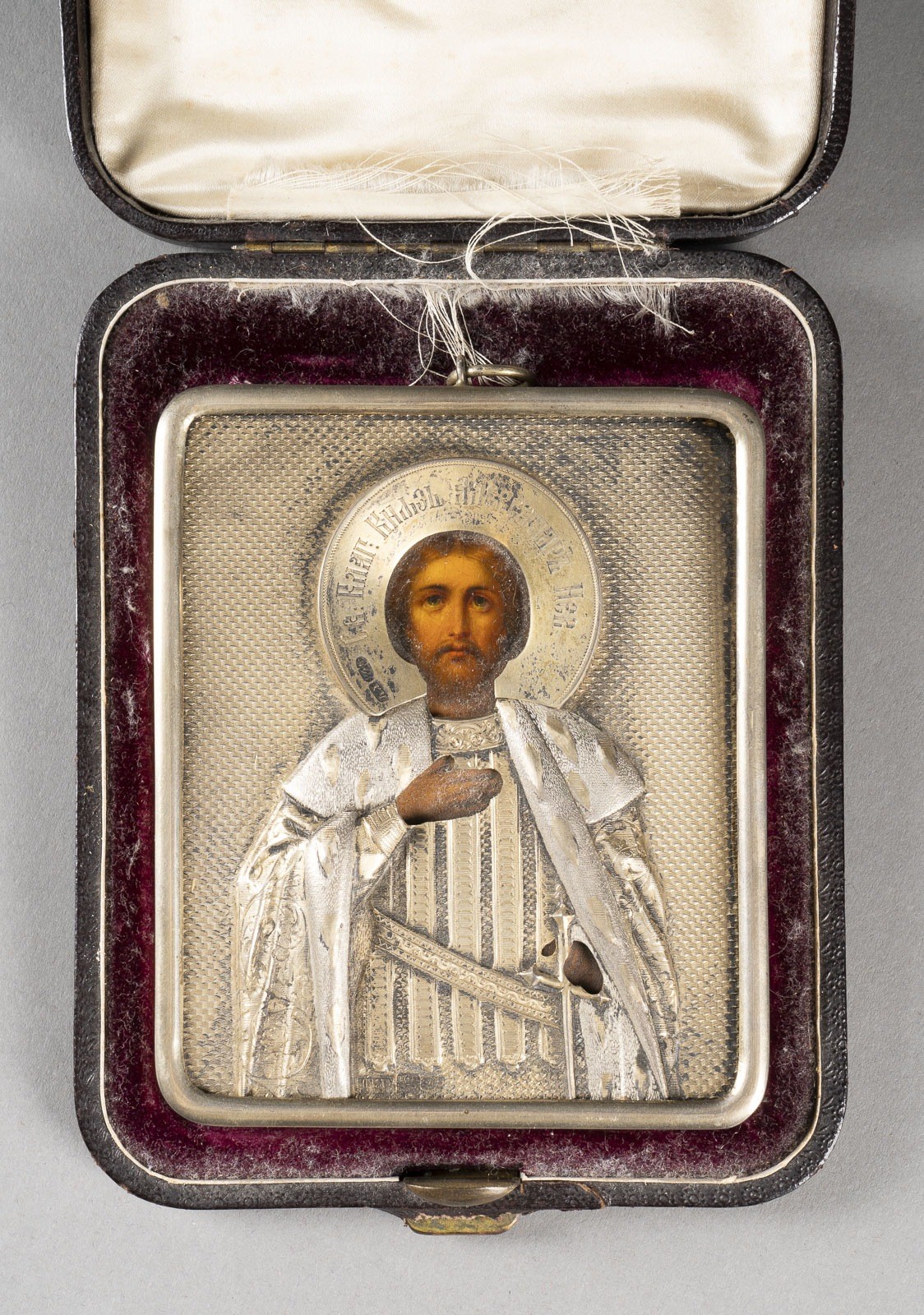 FEINE UND KLEINE IKONE MIT DEM HEILIGEN ALEXANDER NEWSKI MIT VERMEIL-OKLAD IM ORIGINAL-ETUI