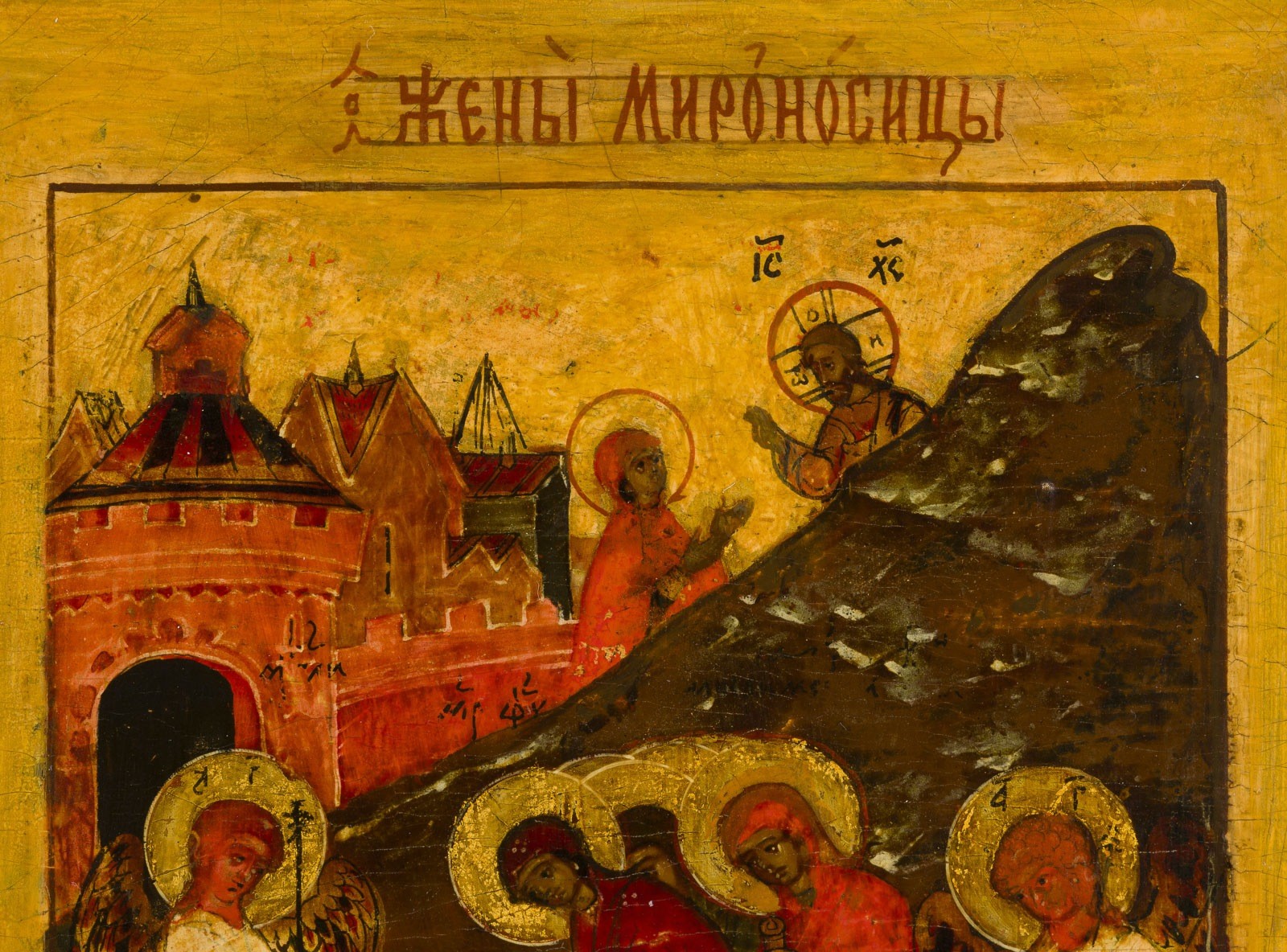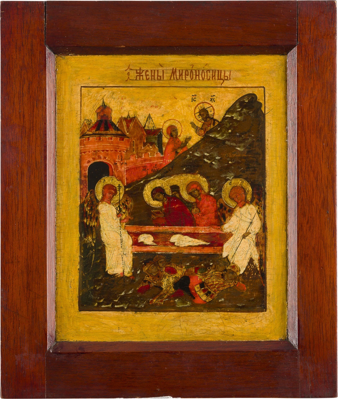 FEINES DOPPELSEITIGES TABLETKA MIT DEN FRAUEN AM LEEREN GRAB UND DREI HEILIGEN
