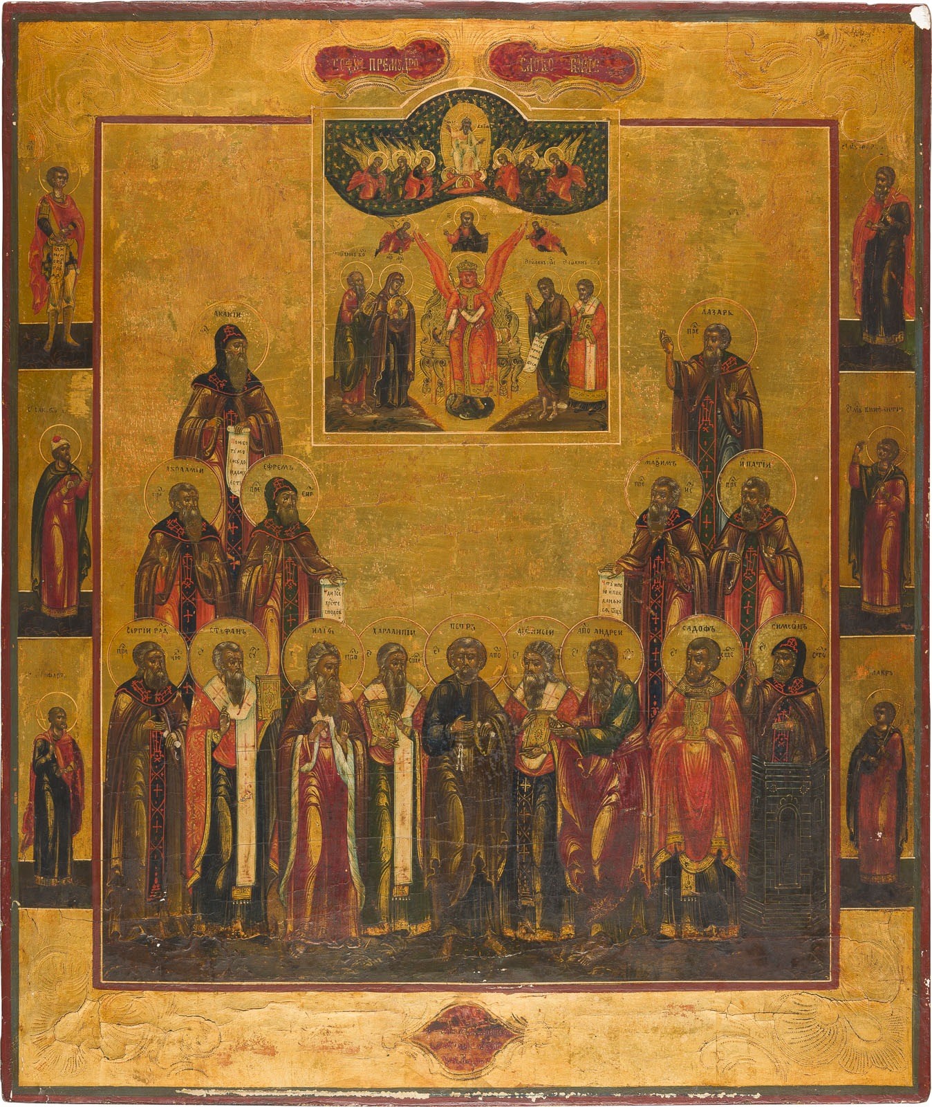 GROSSE DATIERTE IKONE MIT SOPHIA, DER GÖTTLICHEN WEISHEIT UND 15 AUSGEWÄHLTEN HEILIGEN