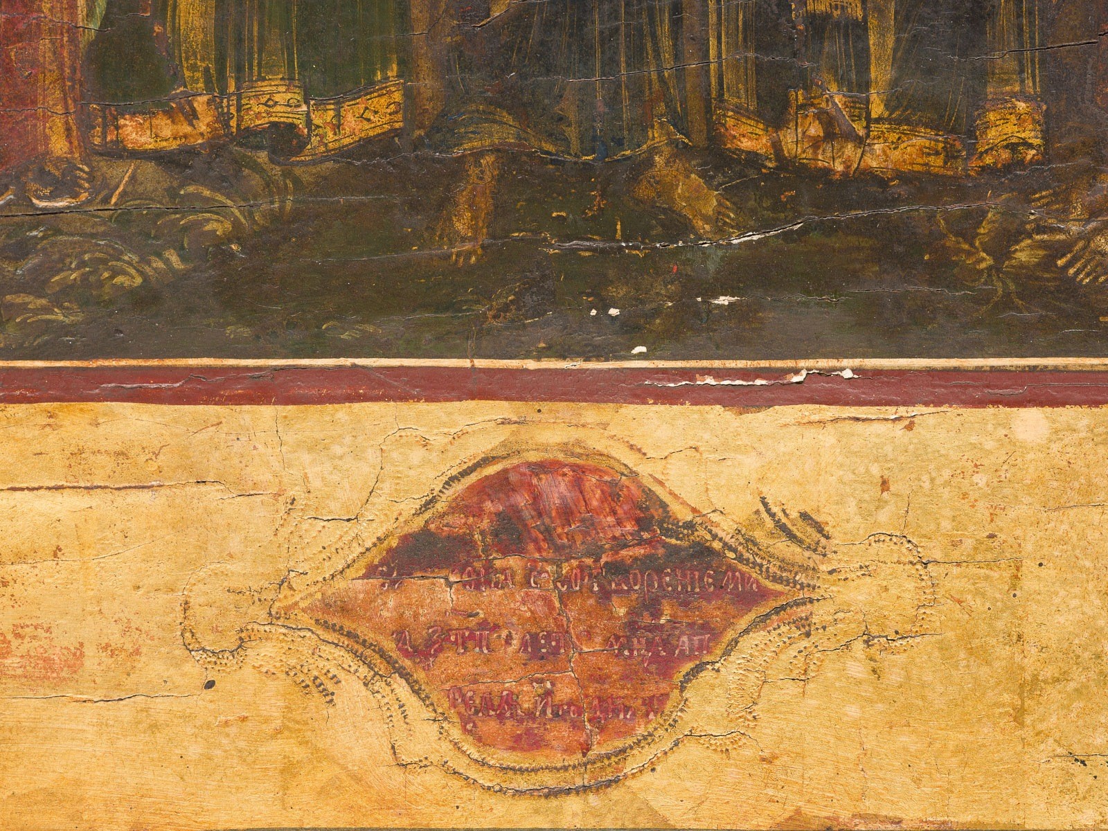 Verbund mehrerer Bretter mit zwei Rückseiten-Sponki (einer verloren). Eitempera auf Kreidegrund, Hintergrund vergoldet, Randbereich vegetabil graviert. 44,2 x 37,5 cm. Kyrillische Inschrift mit Datierung '7380' am unteren Rand. Sechs Randheilige, darunter die Heiligen Florus und Laurus. Min. Retuschen.