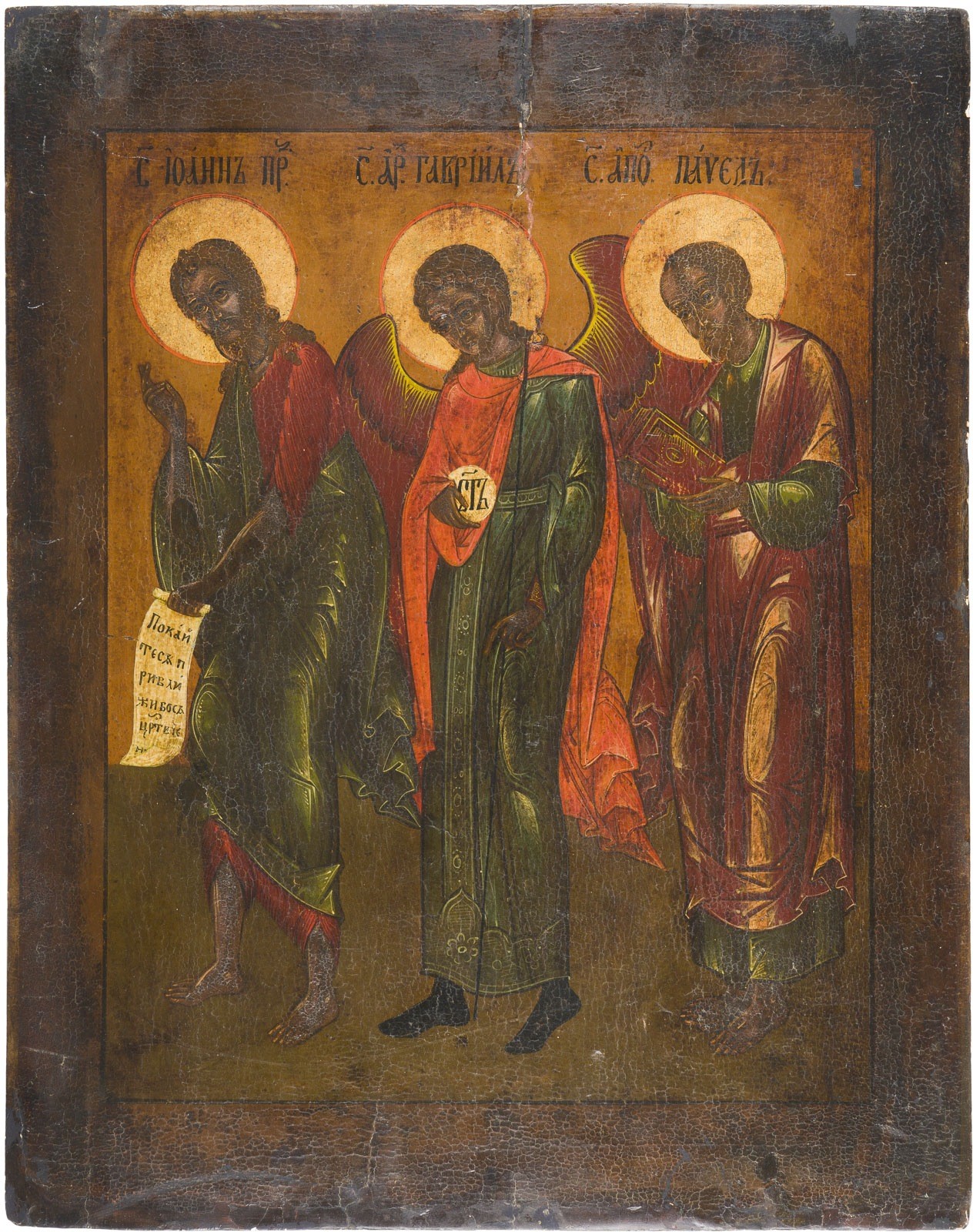 GROSSE IKONE MIT DEN HEILIGEN JOHANNES DEM VORLÄUFER, DEM ERZENGEL GABRIEL UND PAULUS AUS EINER DEESIS-GRUPPE