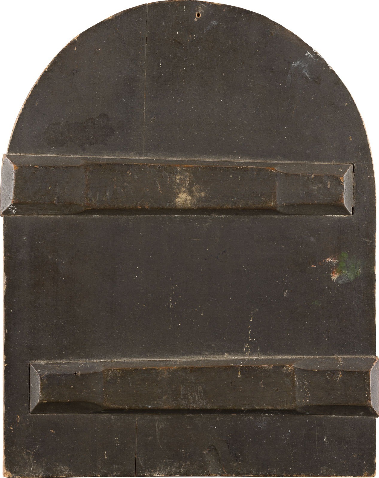 Verbund zweier Bretter mit zwei Rückseiten-Sponki. Kowtscheg, Eitempera auf Kreidegrund, Nimben und Hintergrund vergoldet, ornamentale Gravuren des Randes, Chrysographie. 39,8 x 31,3 cm. Vertikale Rissbildung min. rest.