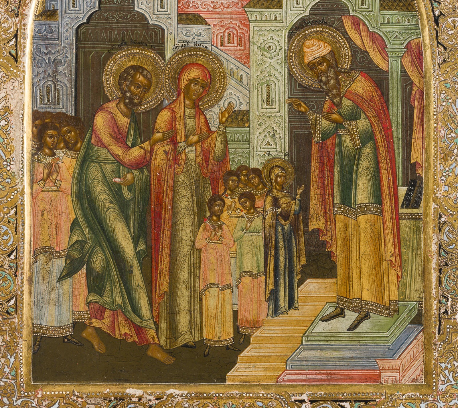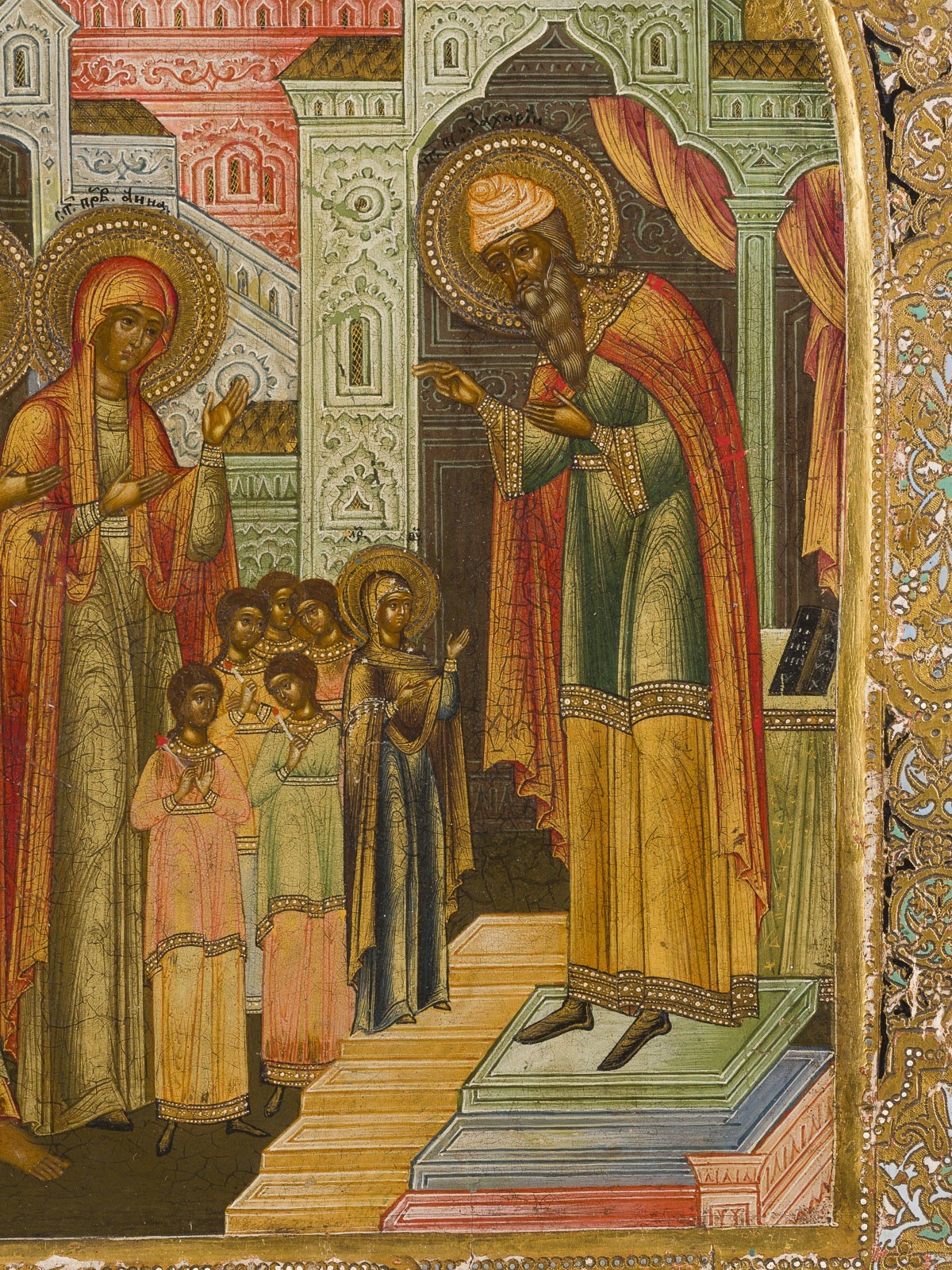 GROSSE UND FEINE IKONE MIT DEM TEMPELGANG DER GOTTESMUTTER