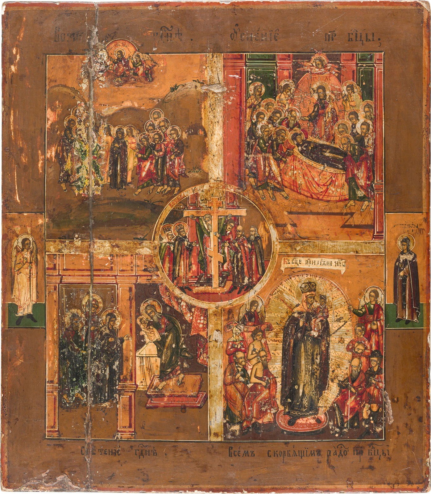 GROSSE VIERFELDER-IKONE MIT HOCHFESTEN UND DER GOTTESMUTTER 'FREUDE ALLER LEIDENDEN'