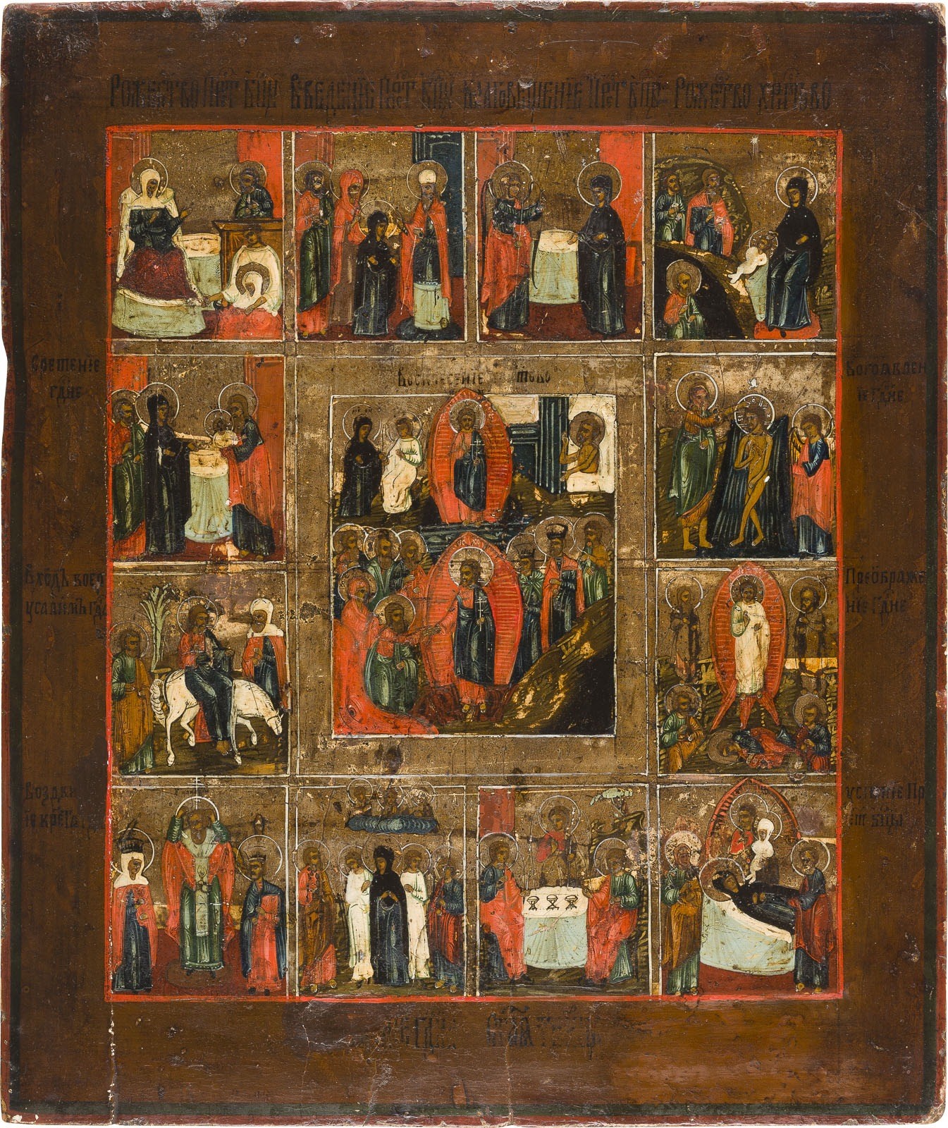 Verbund dreier Bretter mit zwei Rückseiten-Sponki (verloren). Eitempera auf Kreidegrund, versilberter Hintergrund. 43,9 x 37,3 cm. Restaurierungen.