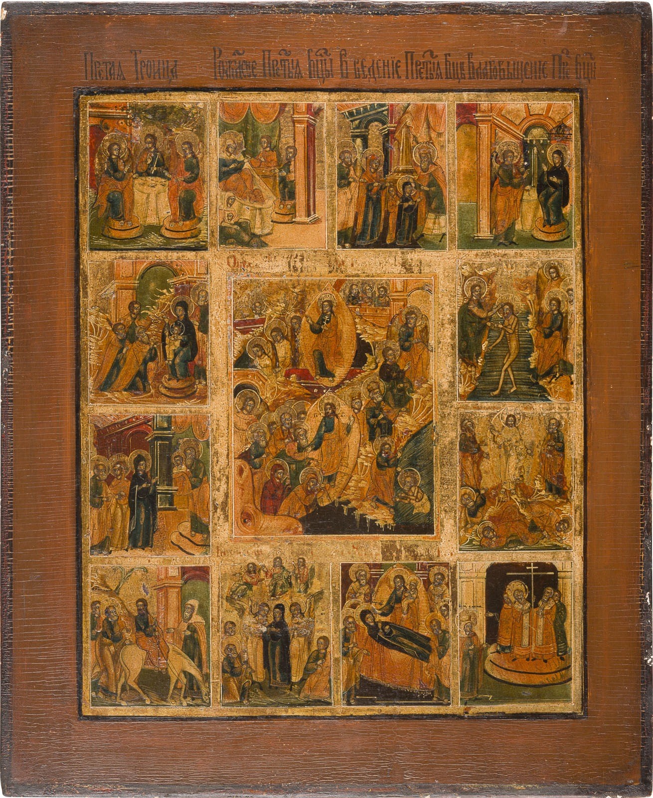 Holztafel mit zwei profilierten Rückseiten-Sponki. Eitempera auf Kreidegrund, Hintergrund vergoldet. 51,5 x 42,5 cm. Min. Retuschen.