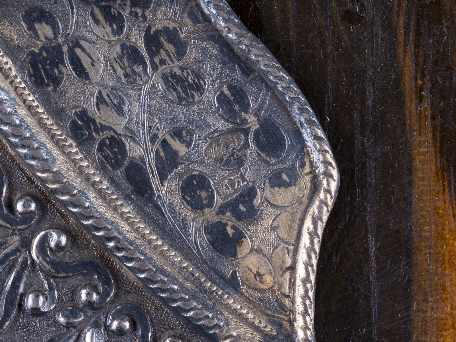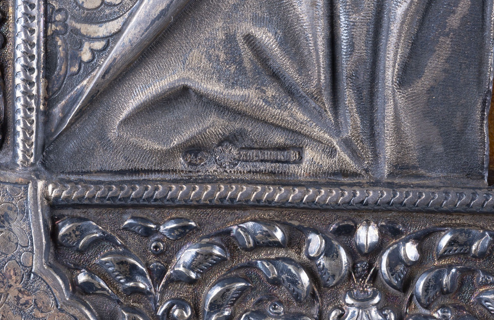 Silber, vergoldet, kräftig getrieben und. 45,2 x 37,5 cm, 965 g. Punziert mit Marke der Bezirksbeschauadministration mit Feingehalt '84' und Meisterzeichen 'ICh' in Kyrillisch sowie 'CHELBNIKOW' in Kyrillisch mit Hoflieferantenzeichen. Malerei rezent.