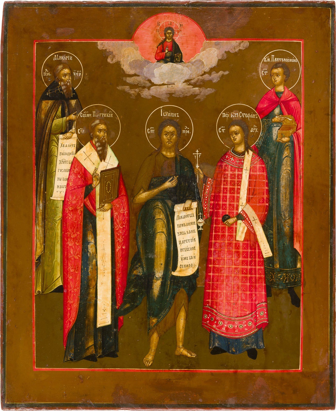 GROSSFORMATIGE IKONE MIT DEM HEILIGEN JOHANNES DEM VORLÄUFER FLANKIERT VON VIER HEILIGEN, DARUNTER STEPHANUS UND PANTELEIMON