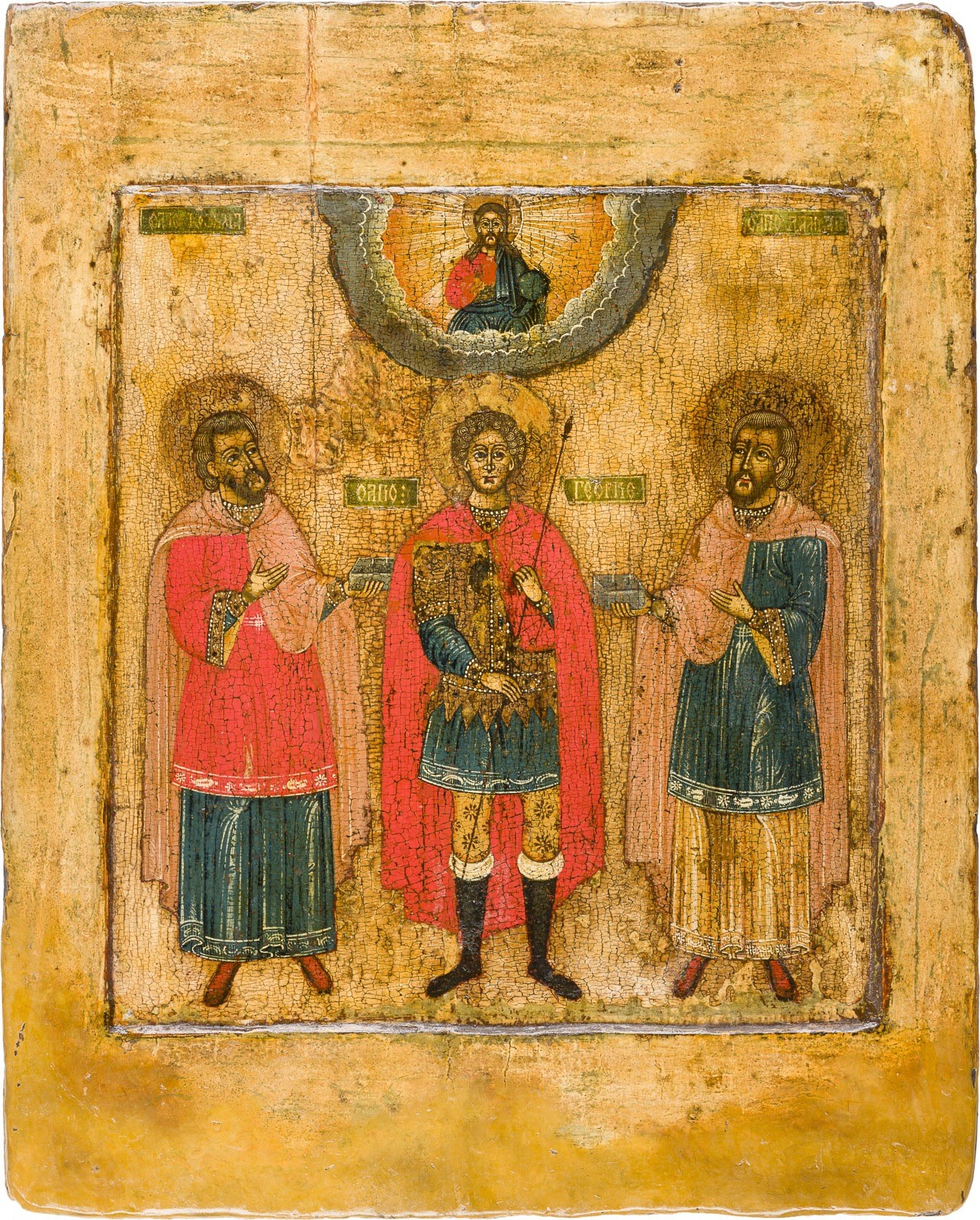 GROSSFORMATIGE IKONE MIT DEM KRIEGERHEILIGEN GEORG FLANKIERT VON KOSMAS UND DAMIAN