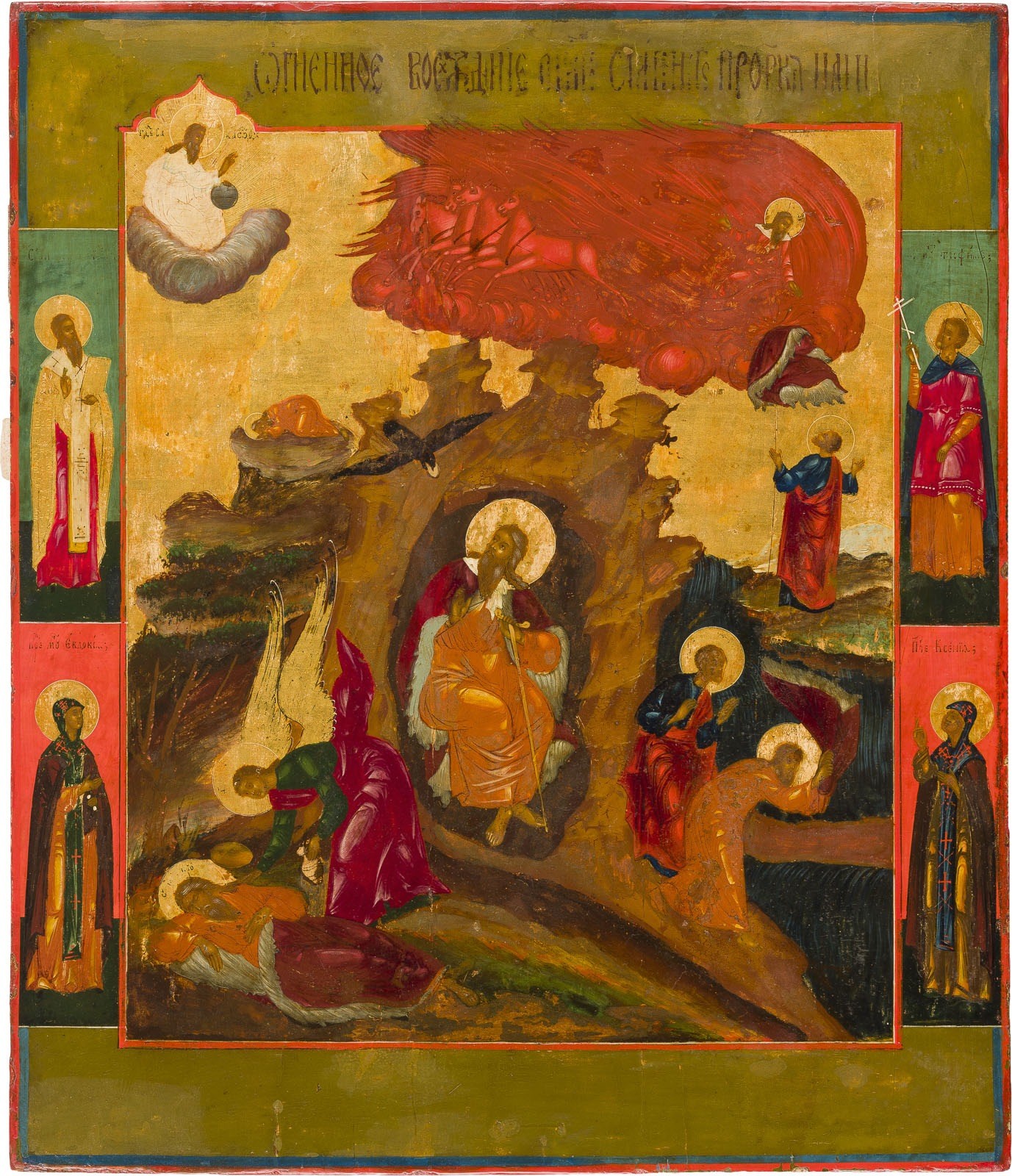 GROSSFORMATIGE IKONE MIT DEM PROPHETEN ELIAS, SEINEM LEBEN IN DER WÜSTE UND SEINER FEURIGEN HIMMELFAHRT