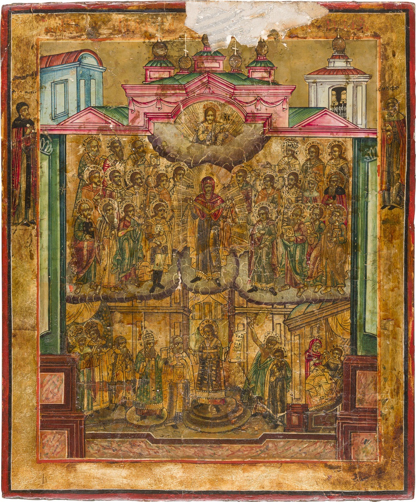 GROSSFORMATIGE IKONE MIT DEM SCHLEIERWUNDER DER GOTTESMUTTER (POKROW)