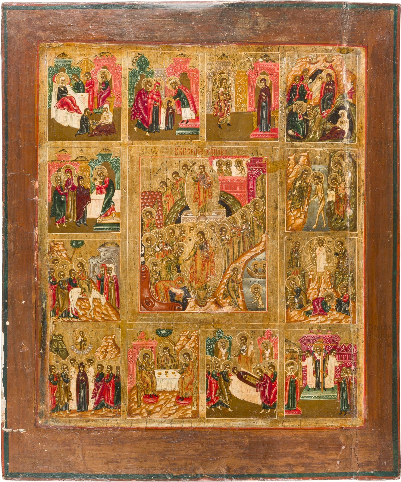 GROSSFORMATIGE IKONE MIT DER AUFERSTEHUNG UND HÖLLENFAHRT CHRISTI MIT ZWÖLF HOCHFESTEN