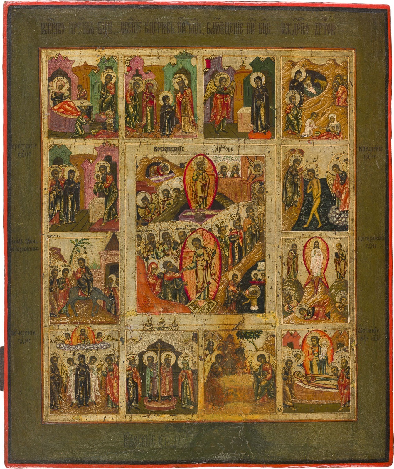 GROSSFORMATIGE IKONE MIT DER AUFERSTEHUNG UND HÖLLENFAHRT SOWIE ZWÖLF HOCHFESTEN DES ORTHODOXEN KIRCHENJAHRES